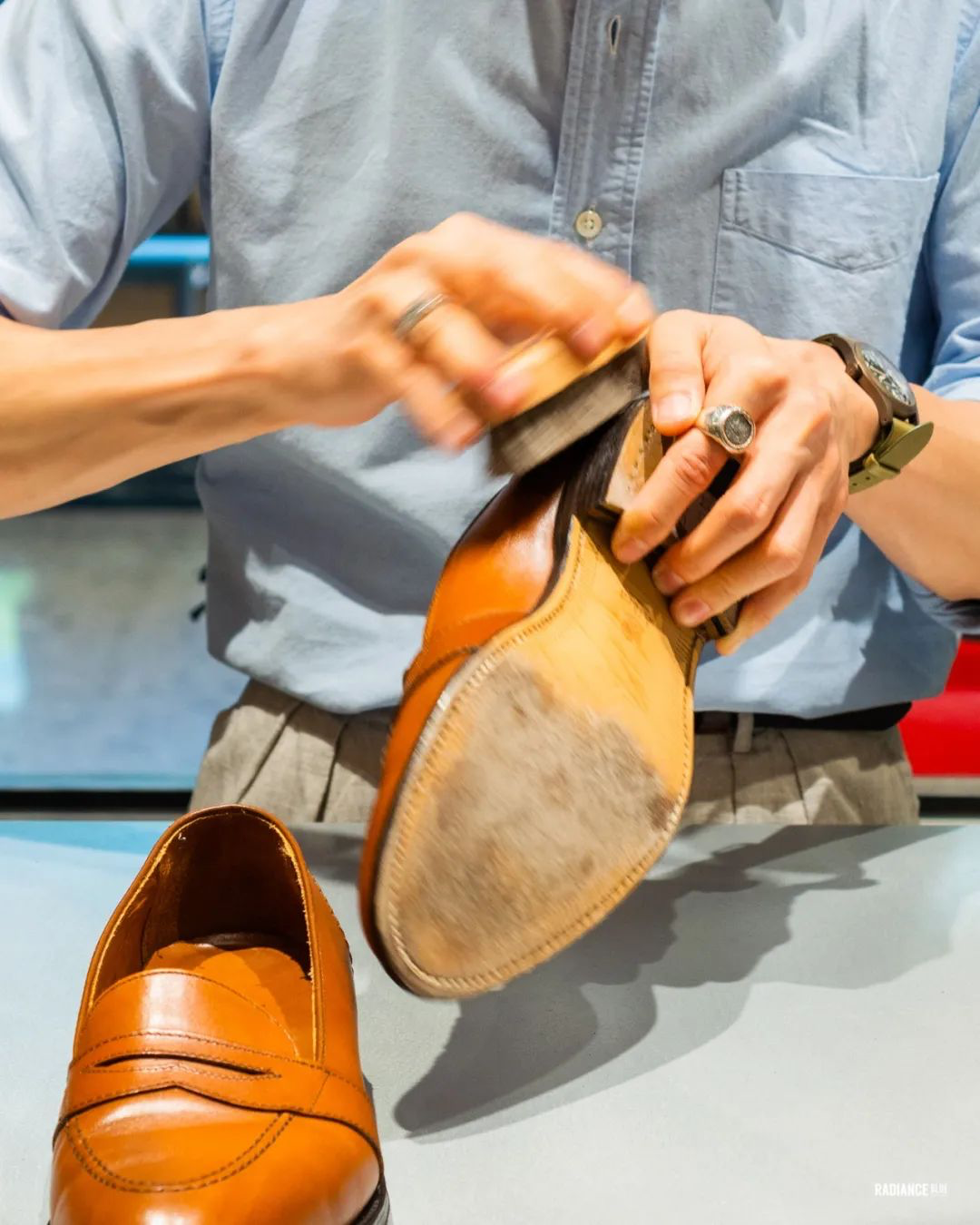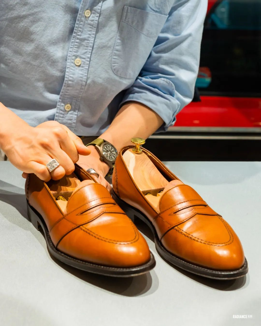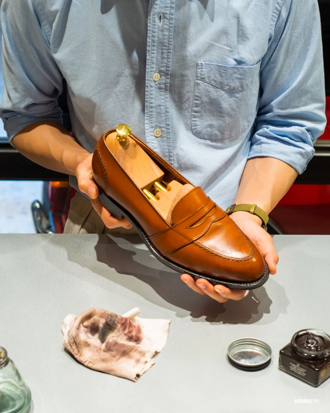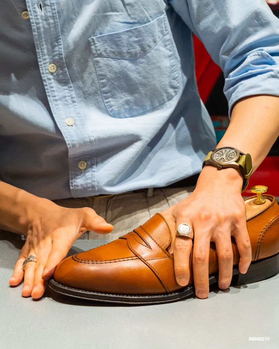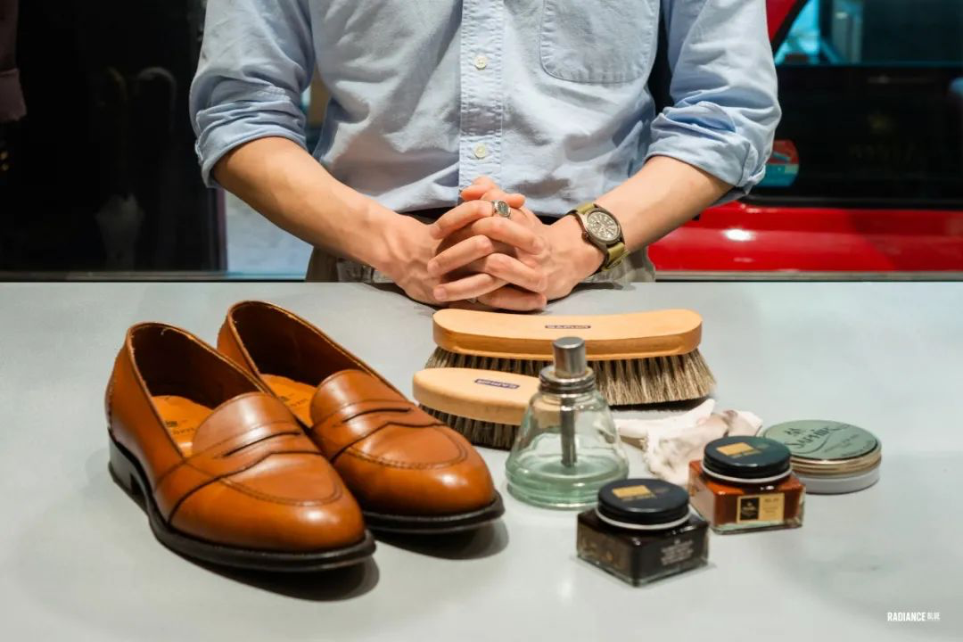 RADIANCE-Blue上海店梁老师教您如何花20分钟新鞋变样,示范鞋子为着用两周左右的Alden Full Strap Loafer 685。