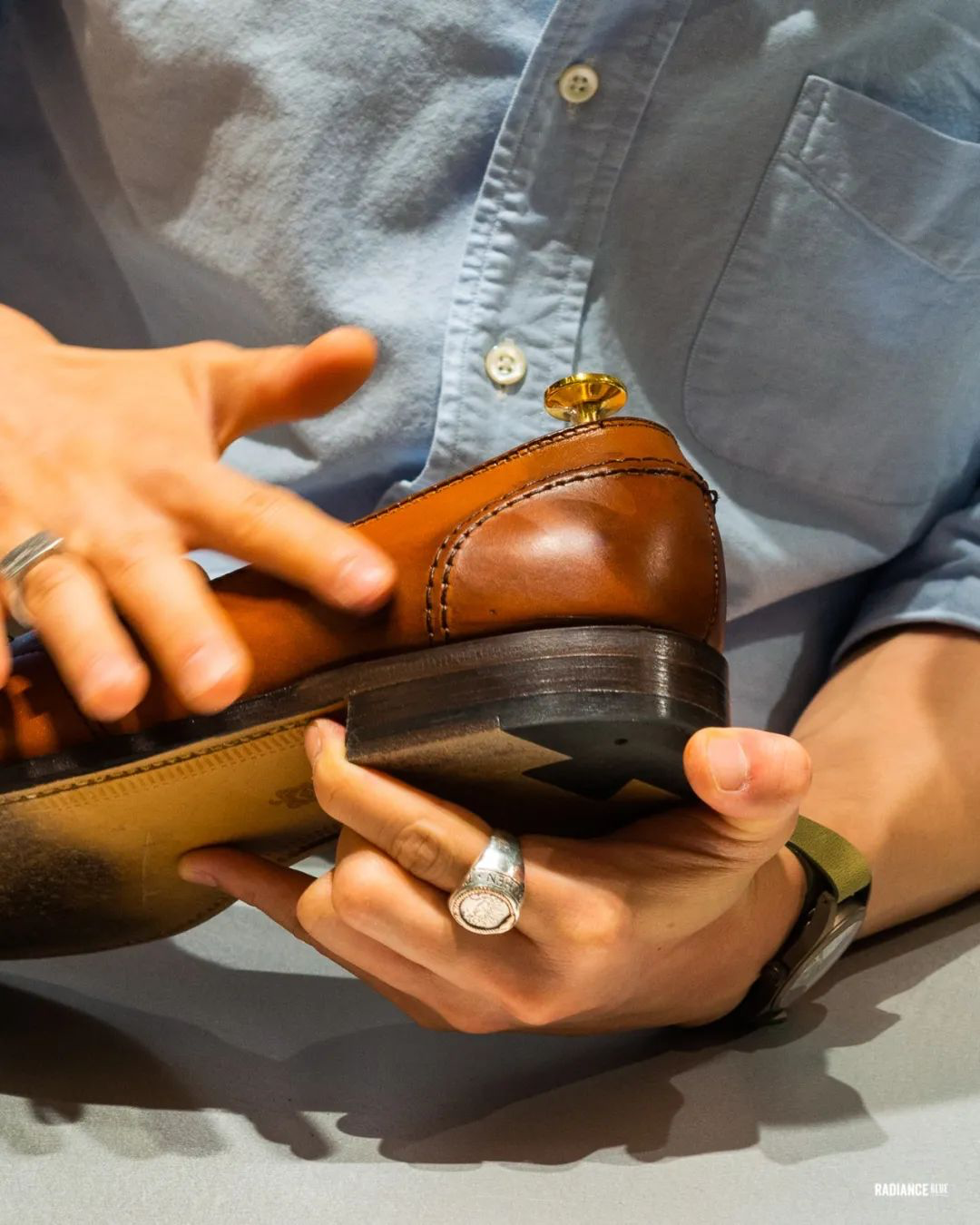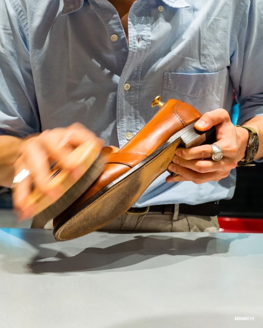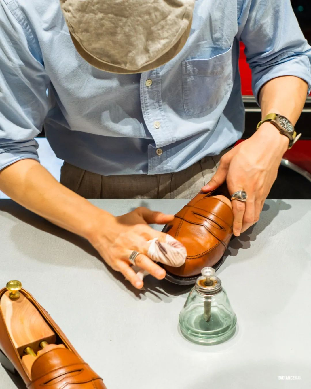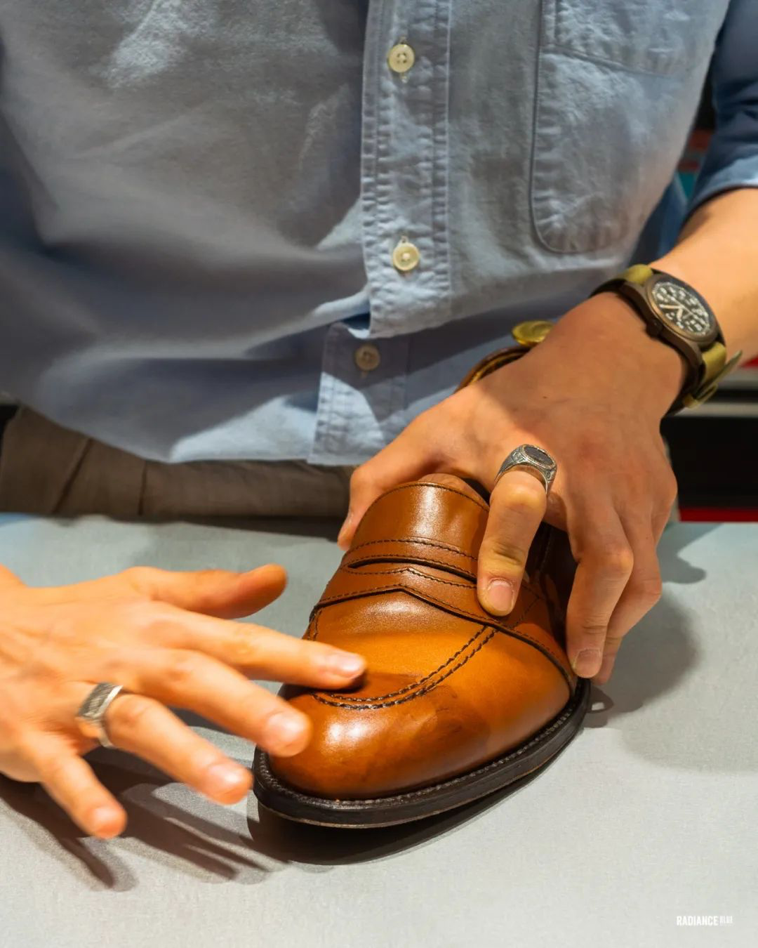 RADIANCE-Blue上海店梁老师教您如何花20分钟新鞋变样,示范鞋子为着用两周左右的Alden Full Strap Loafer 685。