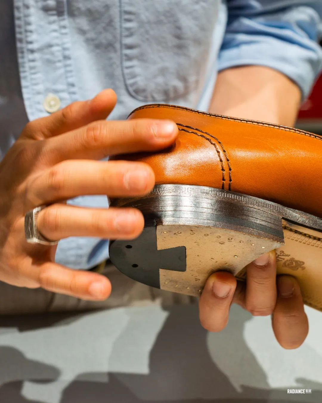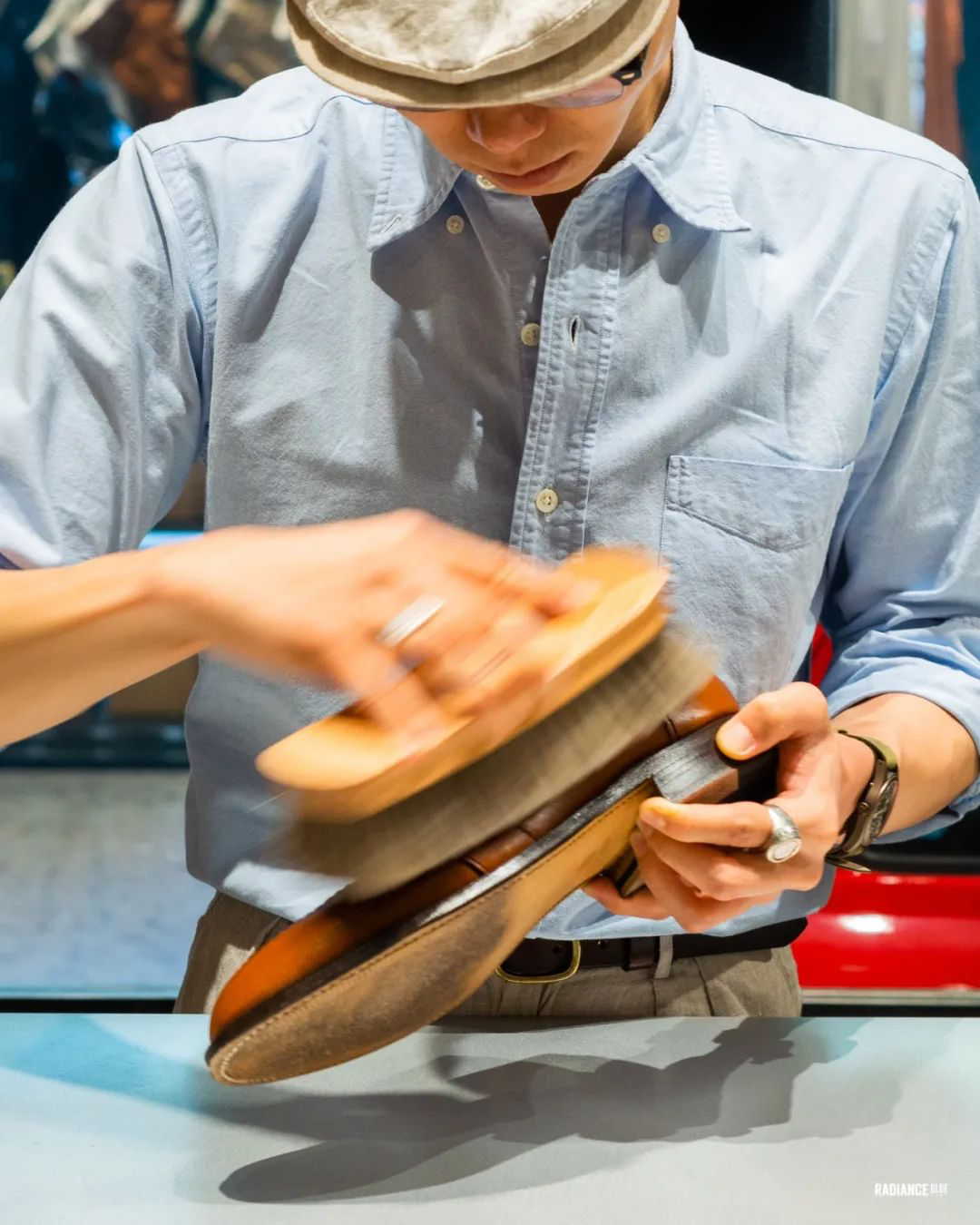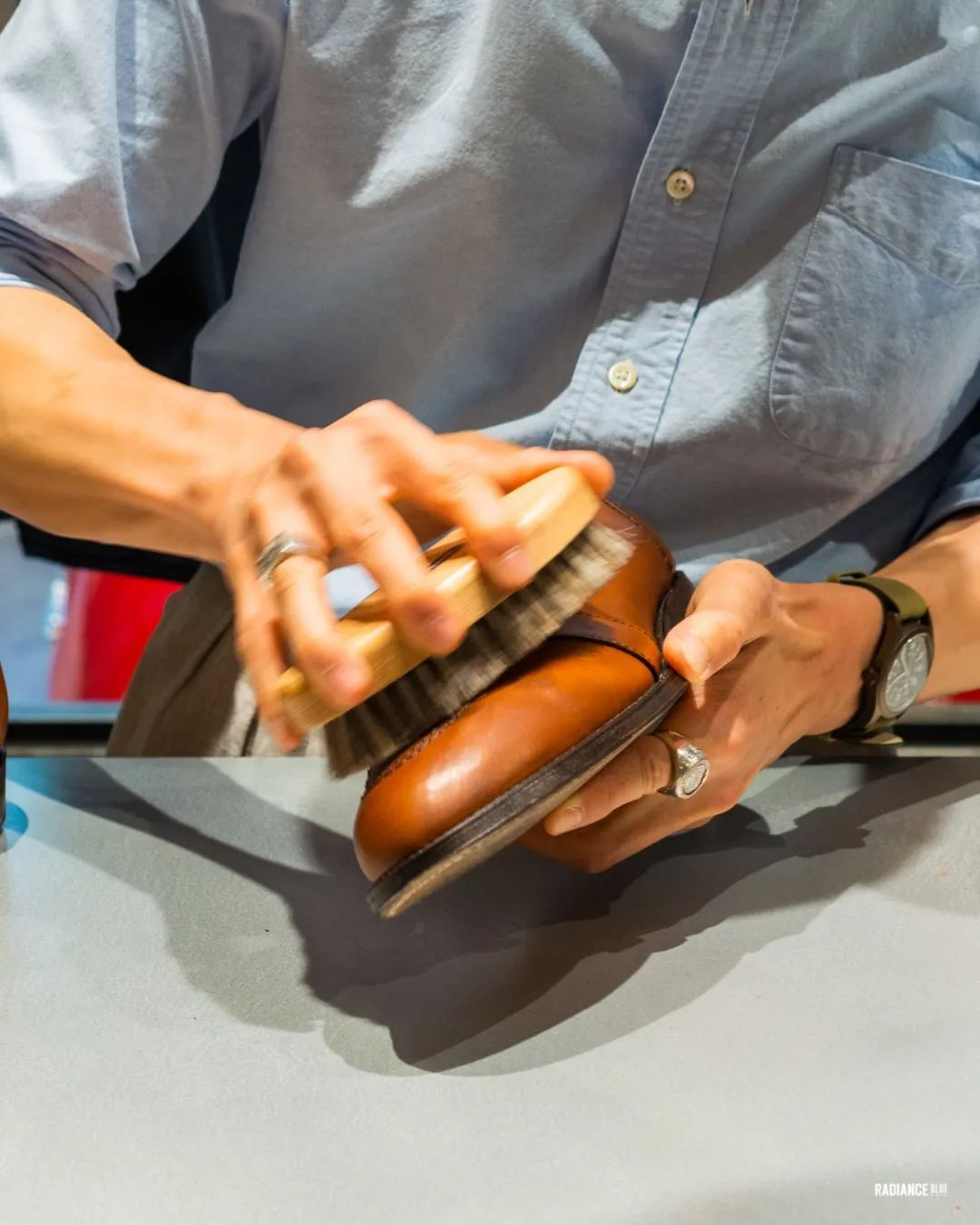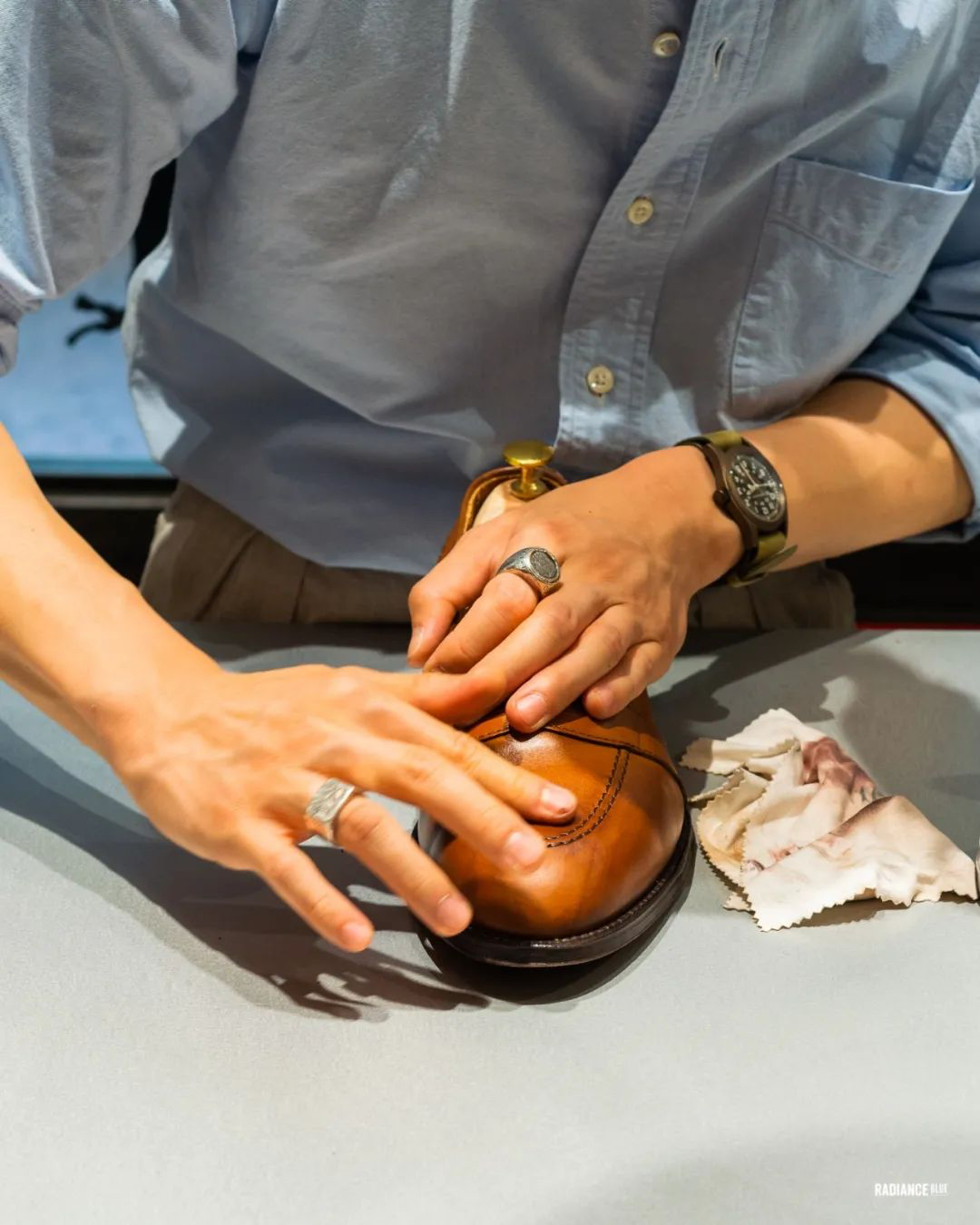 RADIANCE-Blue上海店梁老师教您如何花20分钟新鞋变样,示范鞋子为着用两周左右的Alden Full Strap Loafer 685。