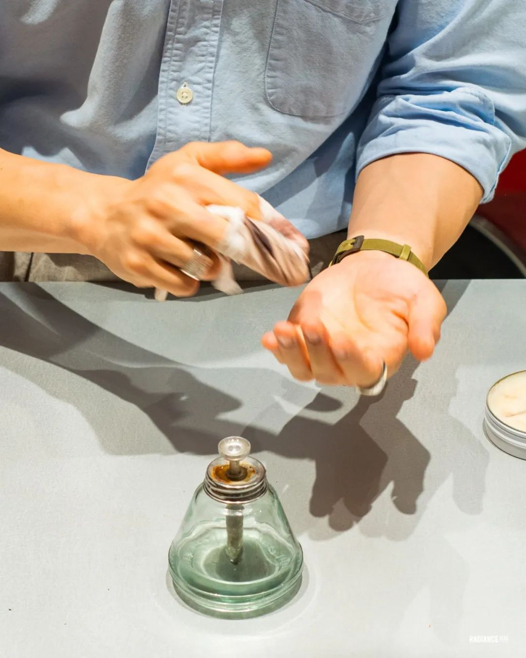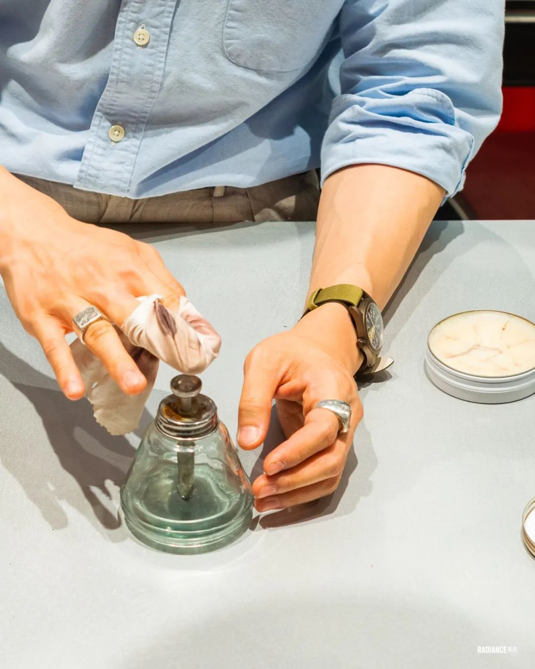 此时请出抛光用小水壶,上面的结构拍一次出一滴水,比较好用。没有的朋友随便找个小盘子倒些纯净水,轻轻沾一滴即可,同理,无需纠结。