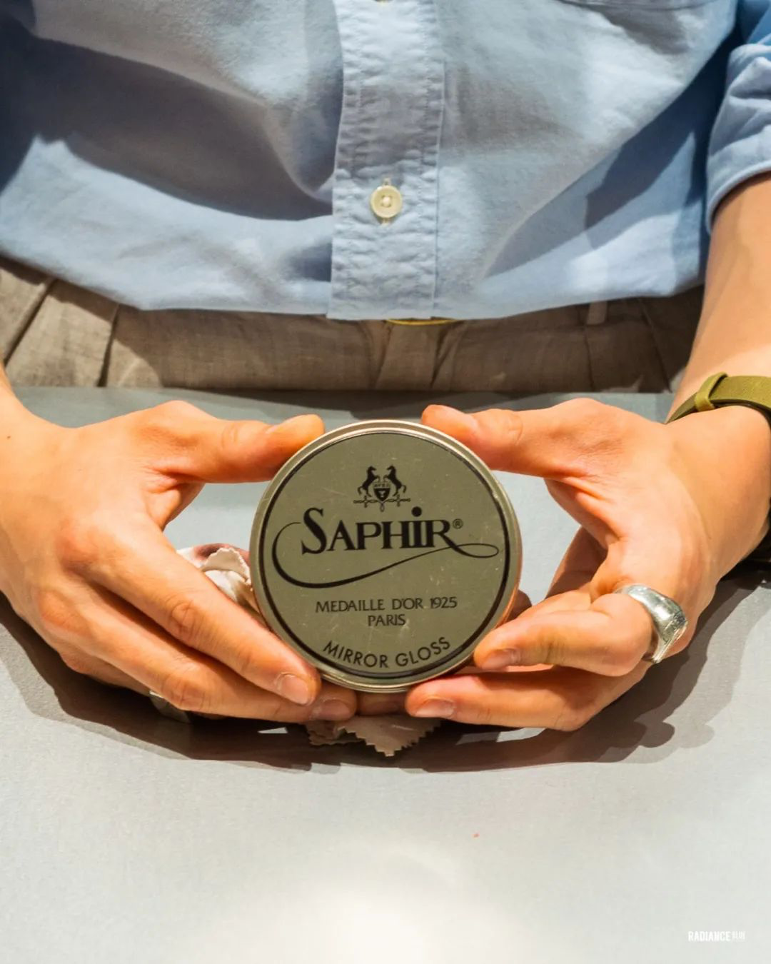 抛光硬蜡,此处选用近年极受欢迎且新手操作不易翻车的Saphir Mirror Gloss Wax Polish,无色。