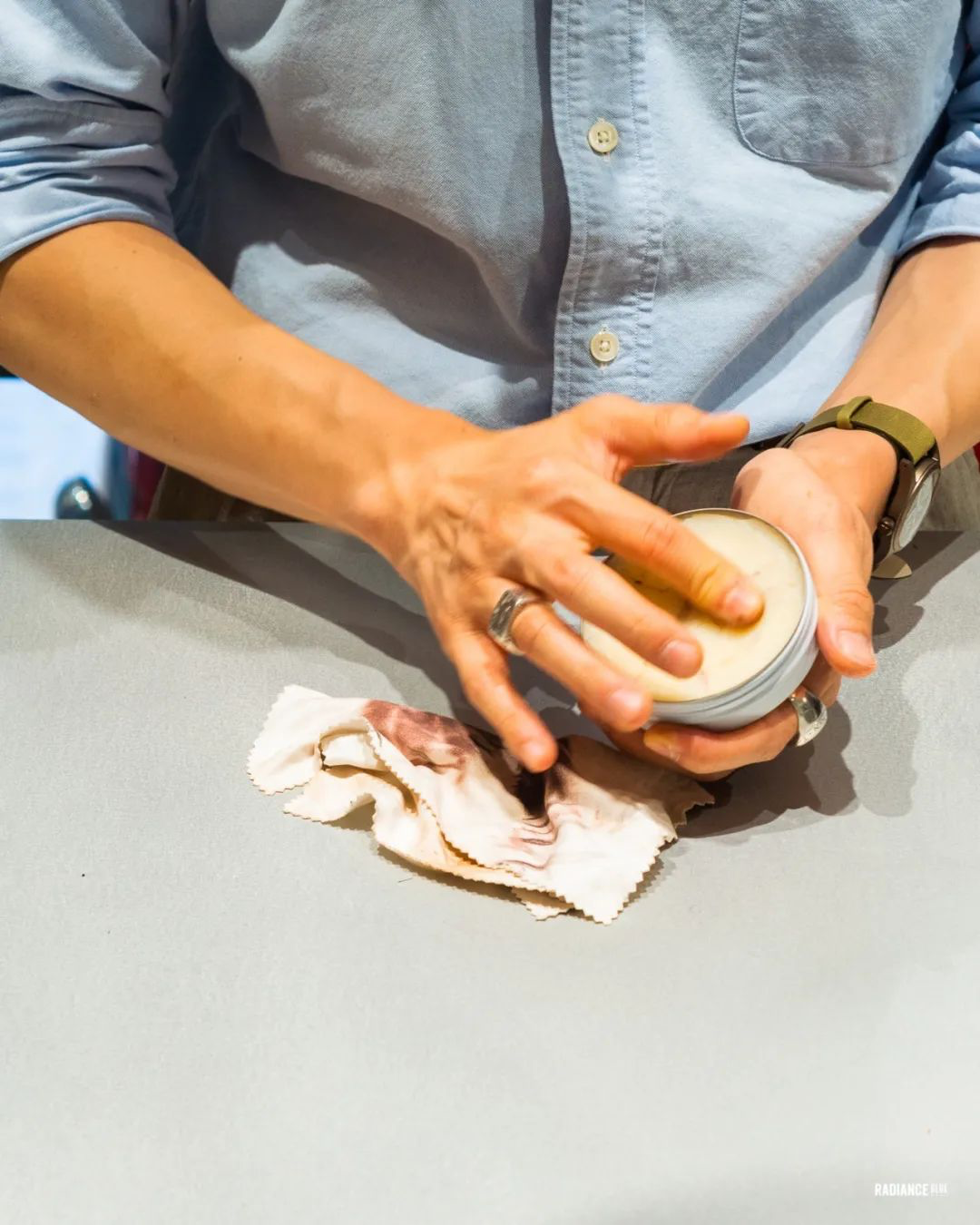 转小圈的方式按摩涂匀。关于鞋乳的涂抹方式也是很多路子,个人比较偏向手指直接接触皮革,手指温度利于油脂化开吧。