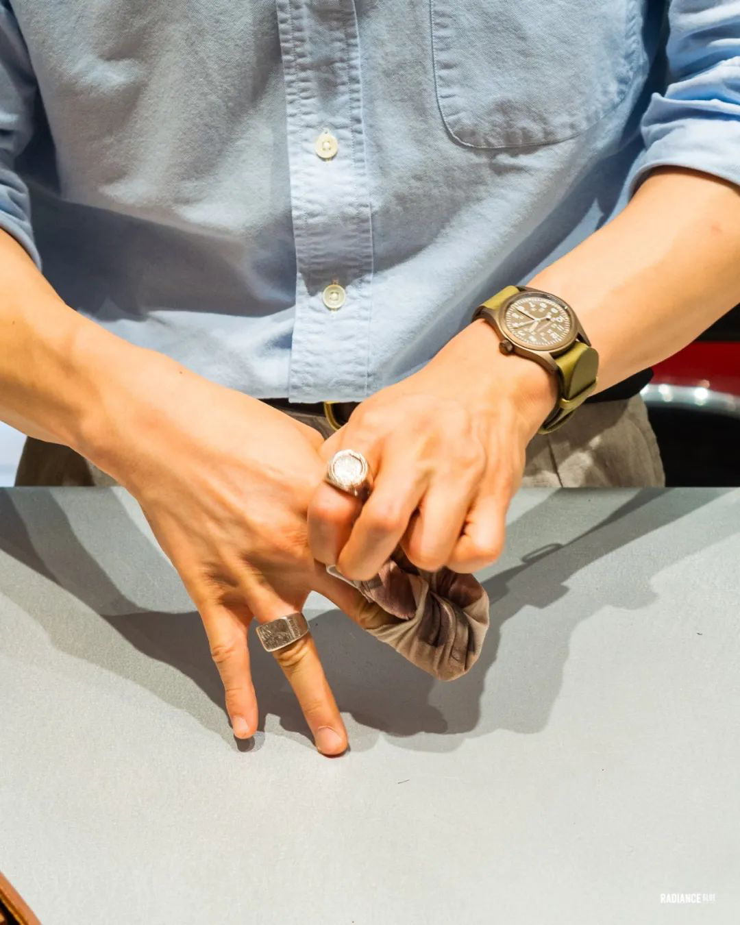 最后我们用抛光布,在手指上绷住,食指无名指之间绕个两下反面掏出来,布就固定了。分解图如下。