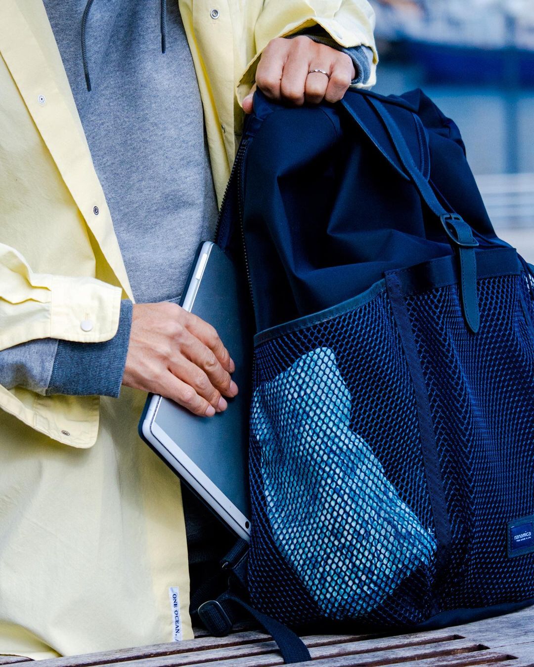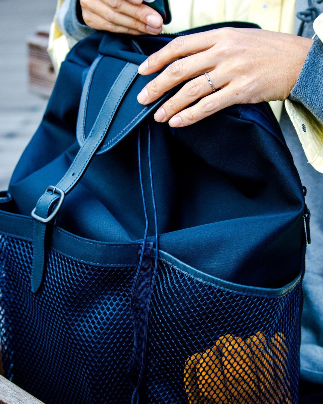 容量方面可以非常方便的装入一个16寸笔记本电脑,此外上方和侧方均有拉链和收纳空间设计,实现了不同物品的有效分区。抽绳细节还可防止物品的滑落,再加上海军蓝的配色堪称百搭,即便是商务出行依然能够保持成熟品位。