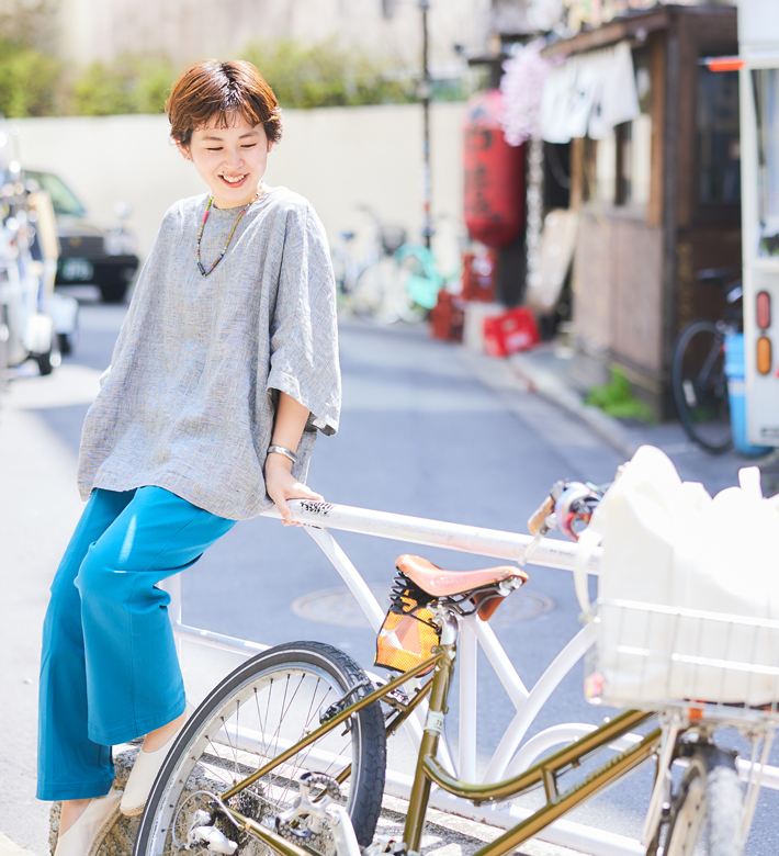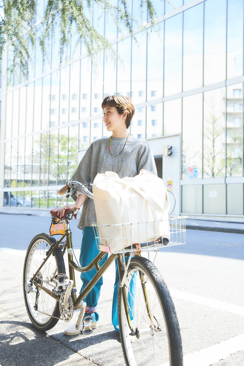除了探索新街区之外,骑行还改变了加瀬谷純奈的一些细节造型思考。比如因为骑车所以平时背单肩包的几率变多了,此外为了放入车篮中,一般买包的尺寸也以车篮的大小为标准。其次日常穿搭也以每天的骑行路线,以及心情去进行搭配。