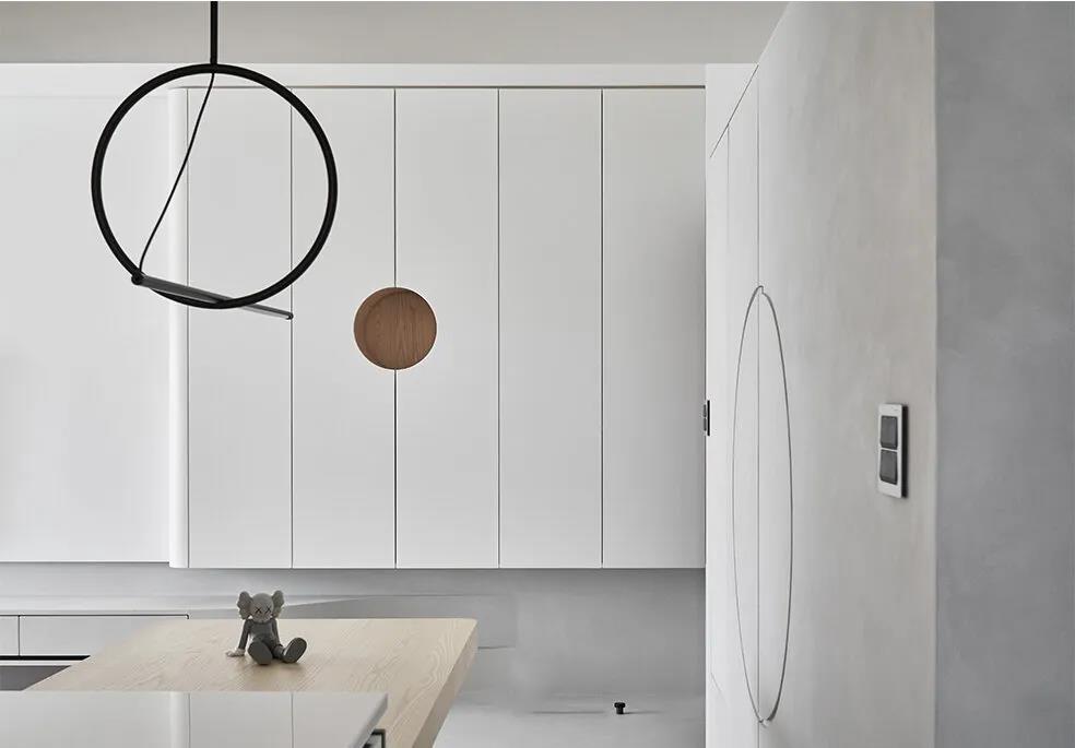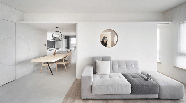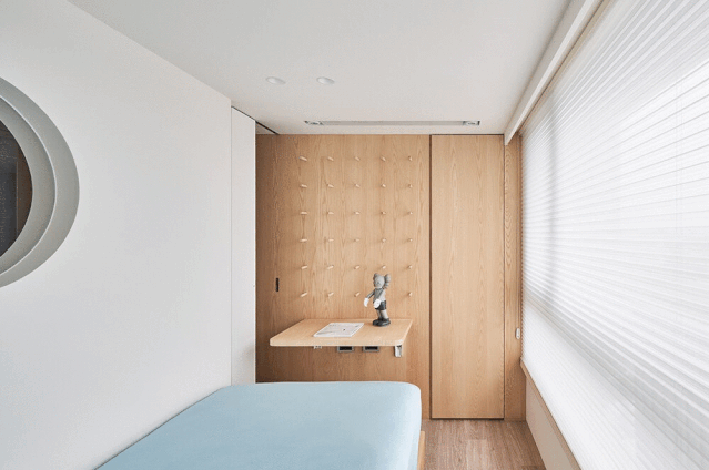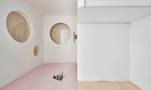 中岛的对面是通往儿童房和主卧的门,而客厅沙发背后的隔墙上也有可以查看儿童房的可开关的圆孔,方便照料儿童的同时增加了采光和趣味性。