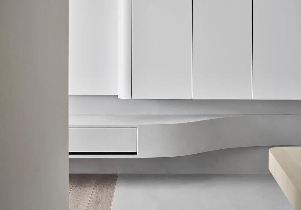 玄关一旁有可伸缩的换鞋凳并且内部有一定的收纳功能节省了入户鞋柜换鞋凳所需的空间,而玄关处也设置了储物柜柜门门板造型隐蔽,和环境融为一体。