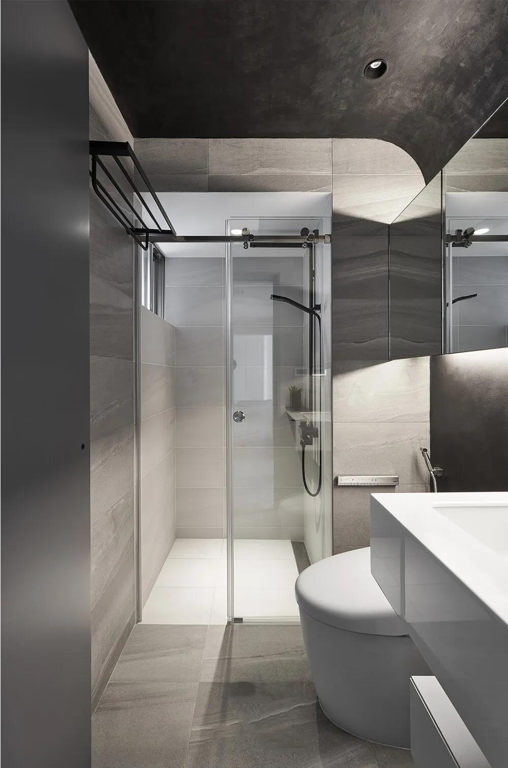 洗手间面积狭小设计师依然保证了空间功能采用了灰色大理石材的墙砖地砖,简洁之中减少了视觉上的繁复感而镜柜的下方使用了灯带保证了照明也增加了气氛。