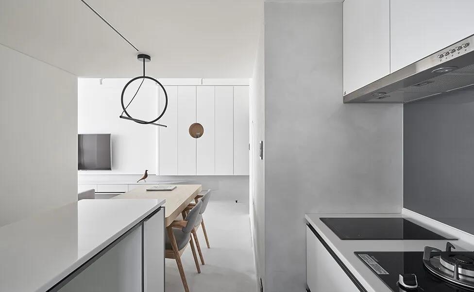 玄关的另一个方向是餐厨空间,靠墙壁的是「一字型」开放式厨房中间的岛台连接餐桌,这是小户型经典的餐厨空间解决方案。