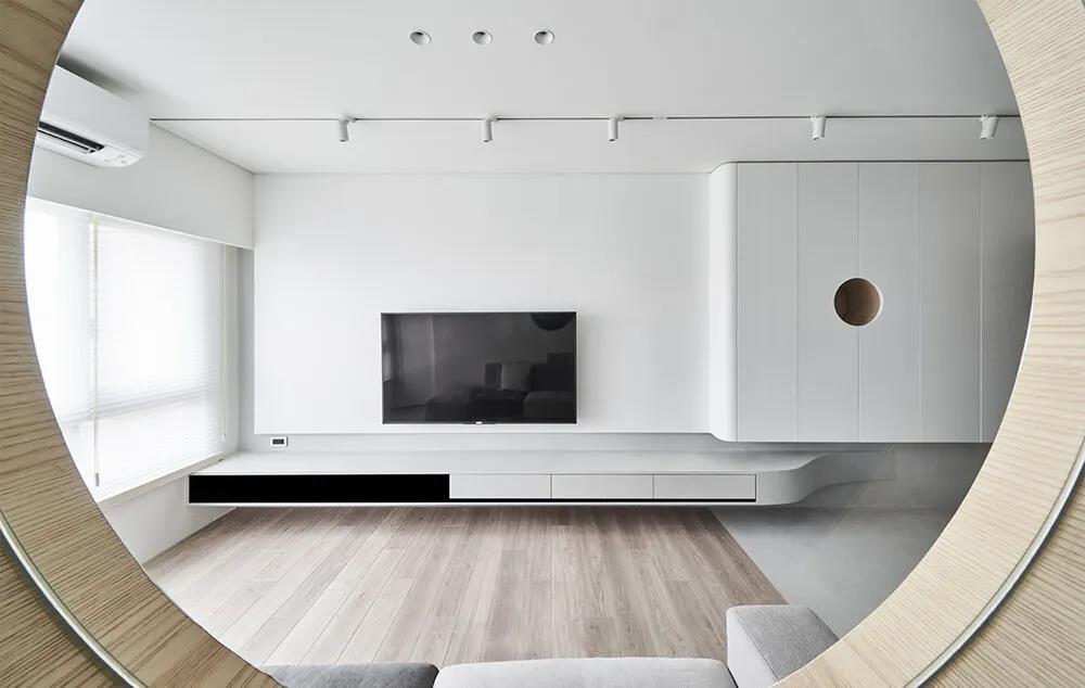 入户门正对的就是客厅,压缩了原始客厅的面积满足影音聚会和客厅收纳更加困难,设计师采用悬空电视柜满足收纳也在视觉上更加轻盈。