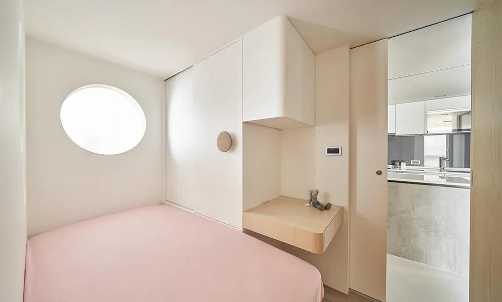 淡粉色床卧室有充足的储物柜可以收纳儿童的衣物和杂物,而另一边的淡蓝色床卧室则充分利用空间打造了可折叠桌板,方便孩子阅读写作。