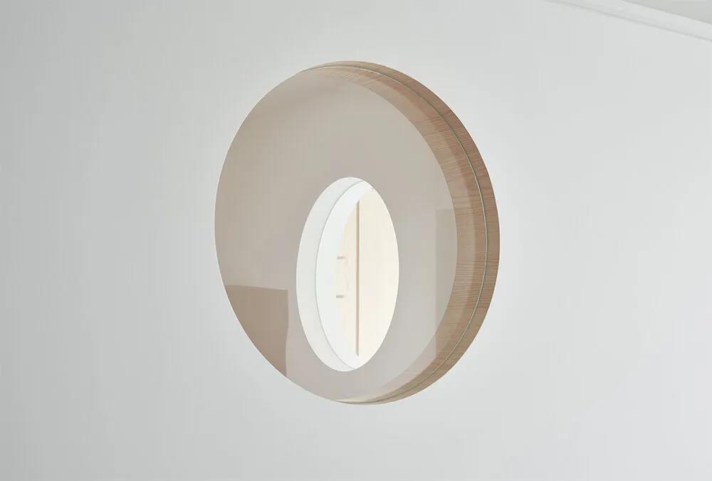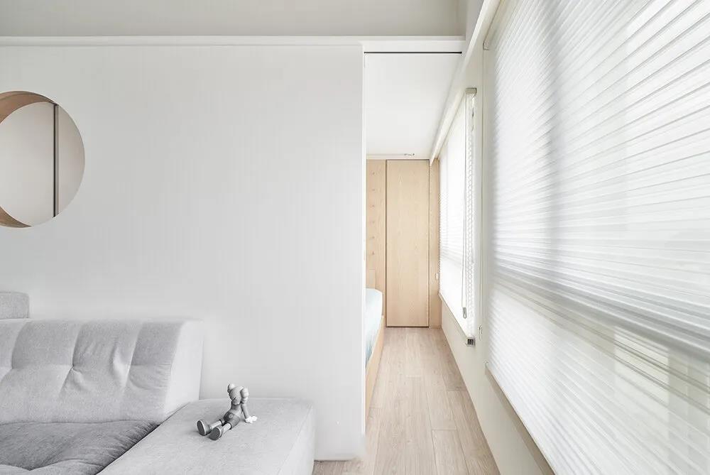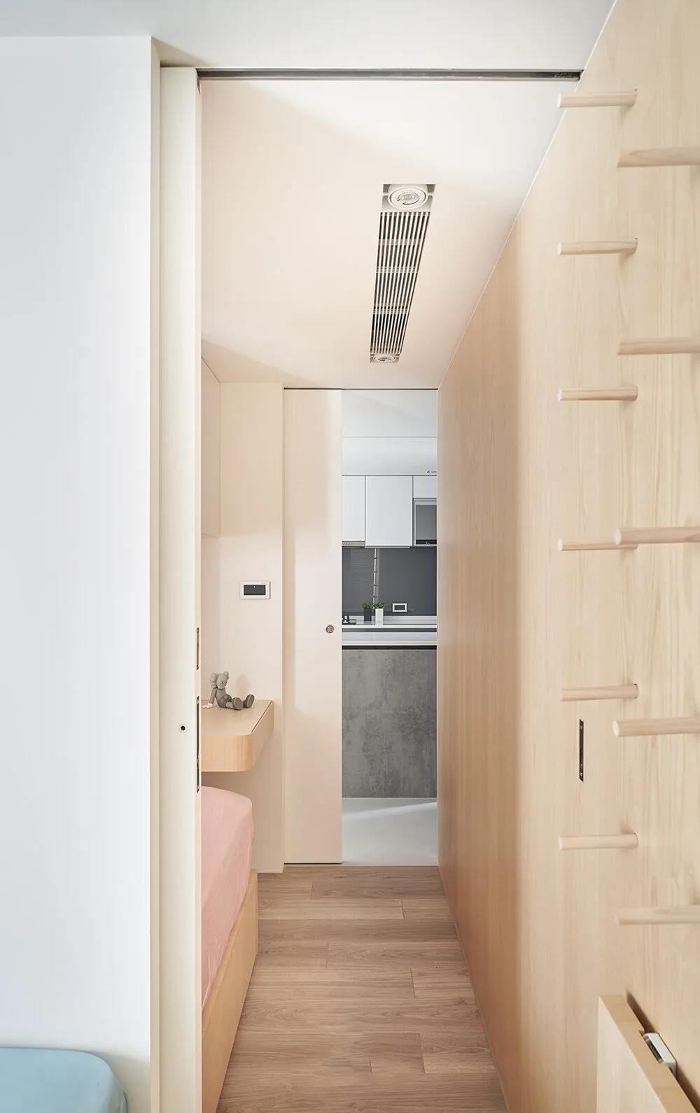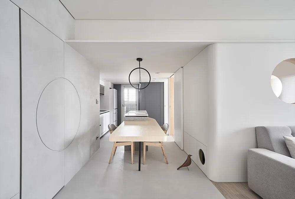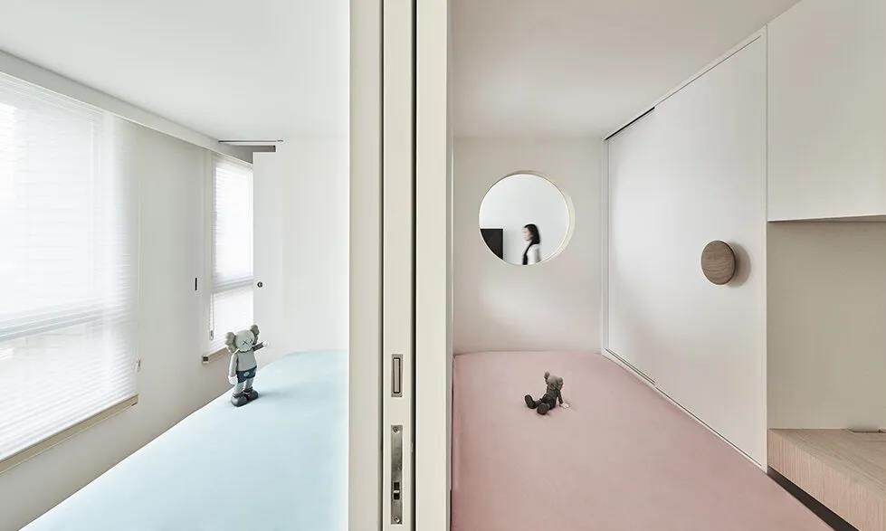 中岛的对面是通往儿童房和主卧的门,而客厅沙发背后的隔墙上也有可以查看儿童房的可开关的圆孔,方便照料儿童的同时增加了采光和趣味性。