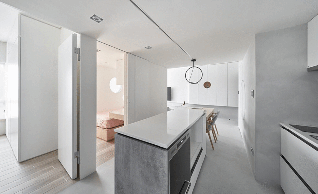 玄关的另一个方向是餐厨空间,靠墙壁的是「一字型」开放式厨房中间的岛台连接餐桌,这是小户型经典的餐厨空间解决方案。