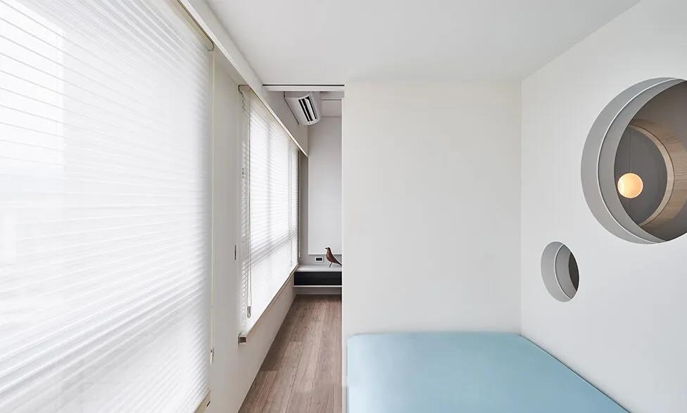 客厅与儿童房还有另一个通道并且共享同一面窗户的采光,来到儿童房的两个卧室由隔墙和移门分隔,隔墙上留有可开关的圆孔可以满足孩子们的交流需要。