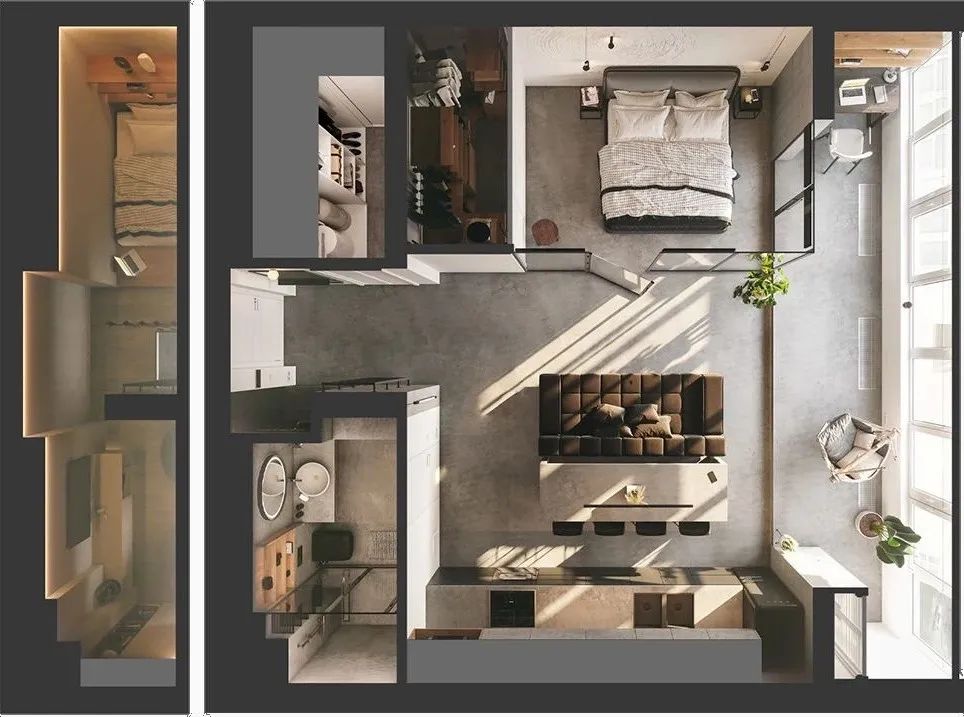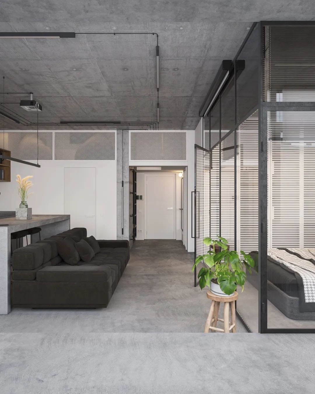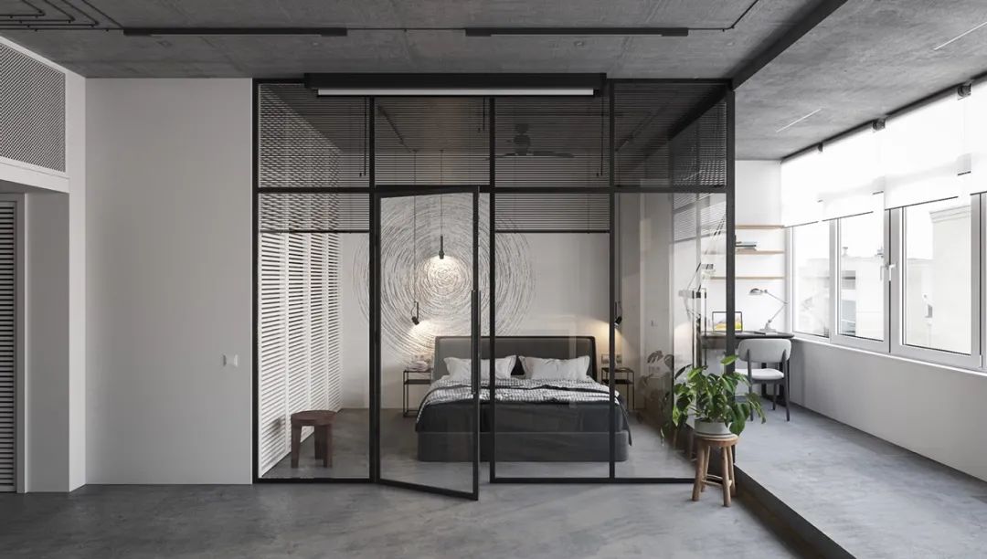 卧室用玻璃作为隔断 光线可以毫无保留的进入其中 也增加了公寓的整体空间感