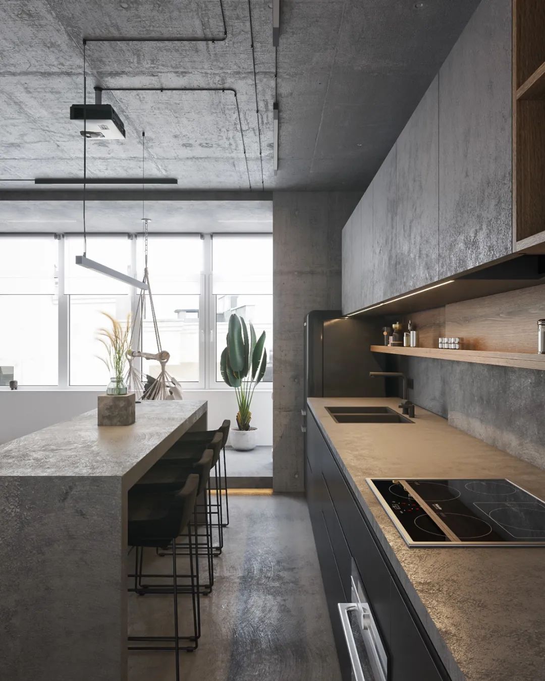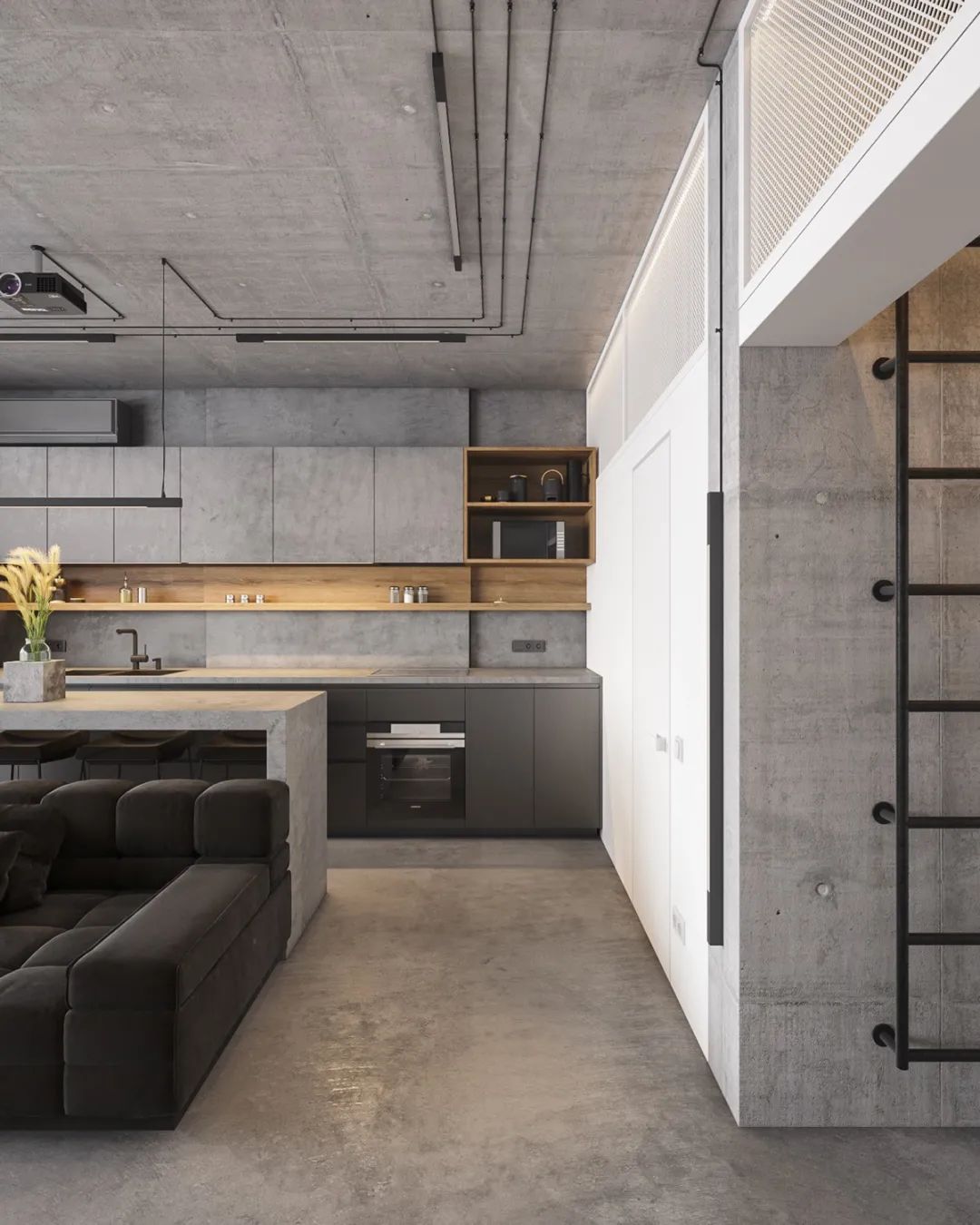 天花板的中心位置安装了投影仪 深灰色的沙发背靠岛台 紧凑又恰到好处