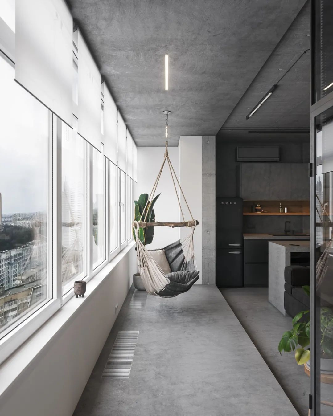 靠近窗户的位置 升高的地板的高度 区分了阳台和起居空间的位置 吊椅给人悠闲舒适的感觉