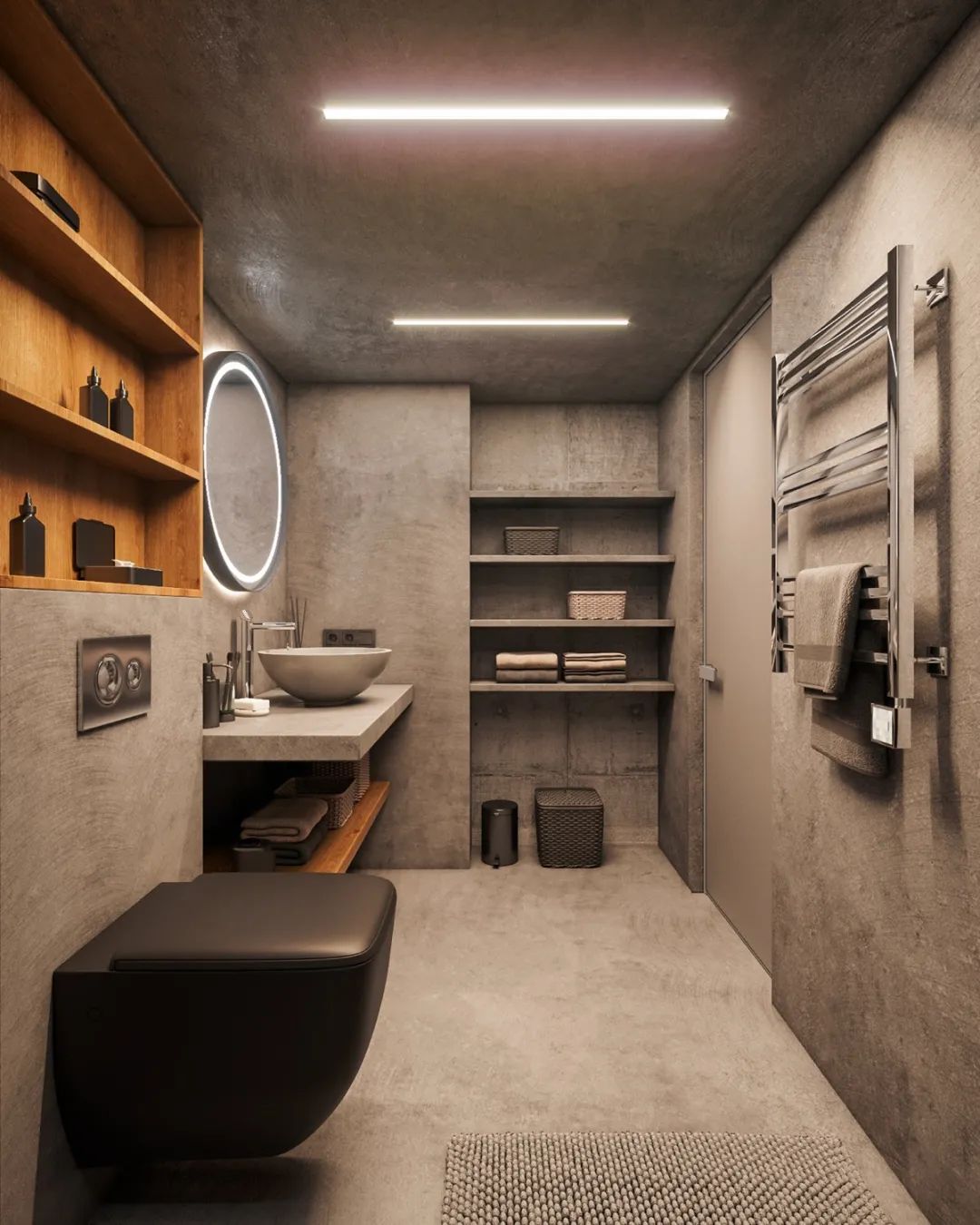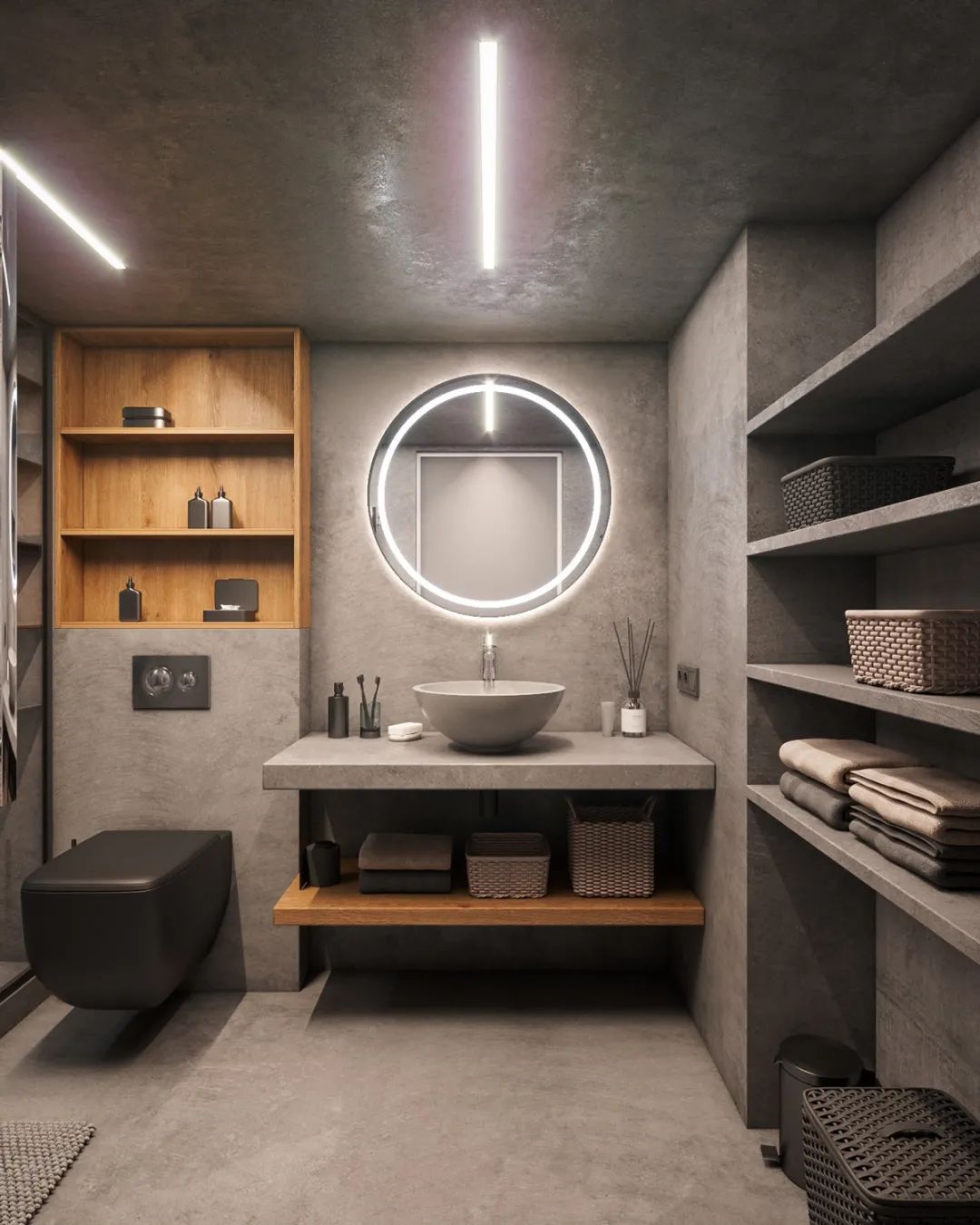 卫生间内以镜子为视觉中心 点亮了灰色的混凝土外观 天然的木元素的融合 与整体设计形成呼应