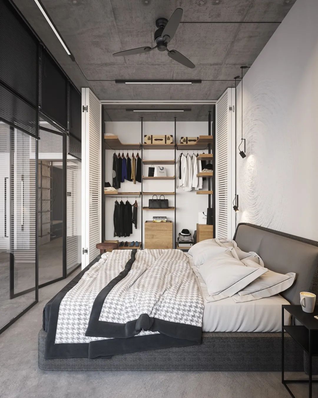 卧室内依旧延续了混凝土的墙面和地面 黑白灰的床品十分利落