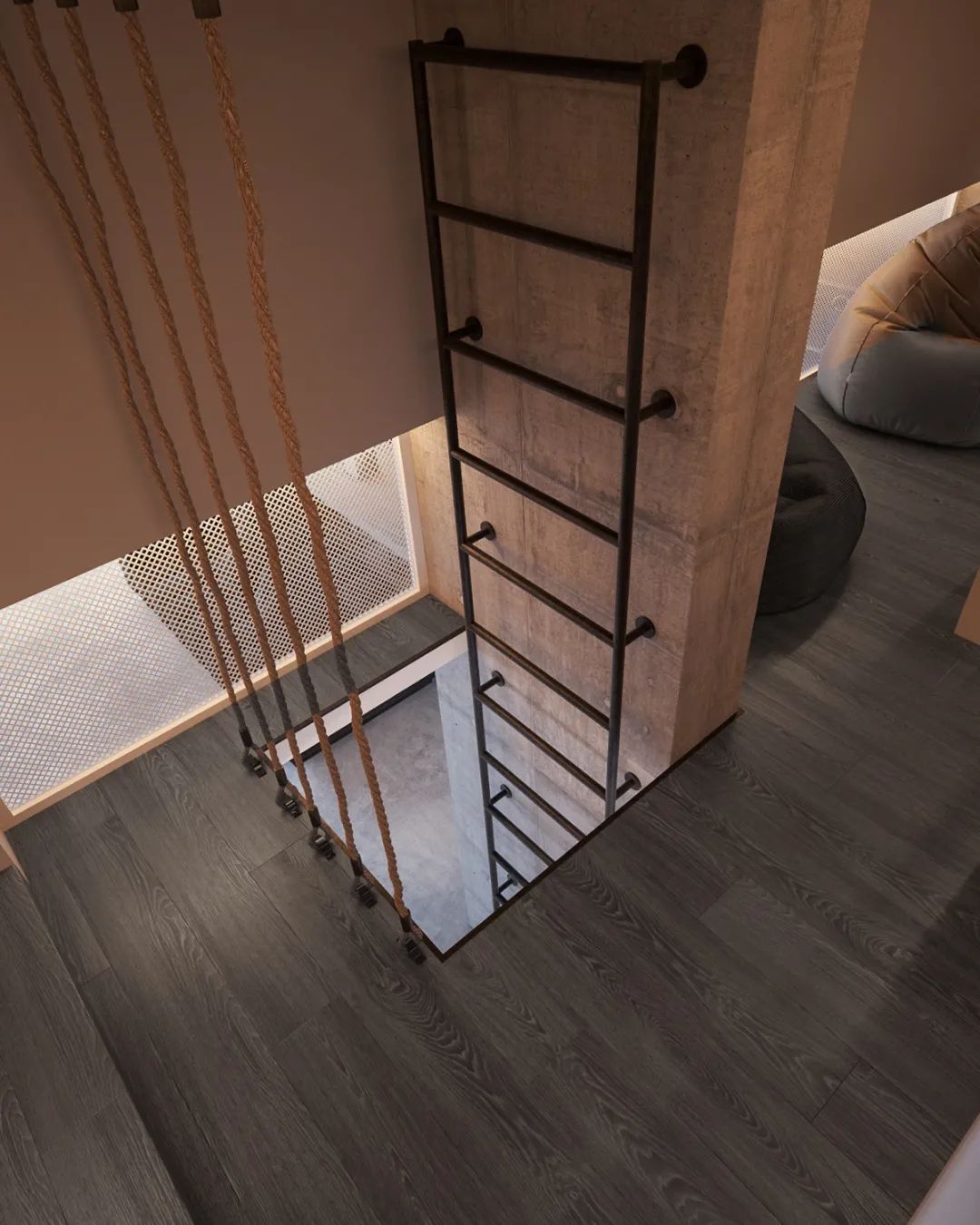 通过一旁的黑色梯子 可以抵达上方的小阁楼 绳状的栏杆起到了保护的作用