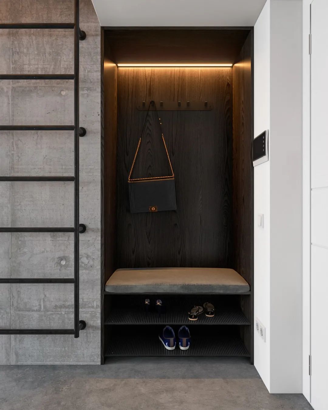 嵌入式的长凳 方便进出换鞋 深色的木材在灯带的照耀下 十分温暖