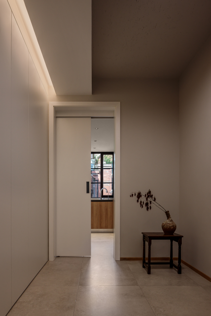 客厅连接阳台的过道,为了更好将室内外氛围衔接,设计借用客厅与主卧之间的墙体厚度设计了一处展示壁龛,底部设置封闭式储物空间,展示与收纳完美结合。