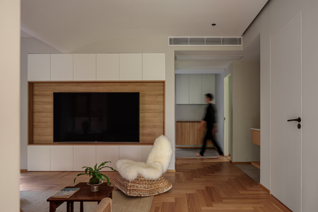 玄关柜面向客厅一侧做内嵌式电视柜,观影与收纳同时进行,并掌握厚度,让柜体与墙体达成统一平面。