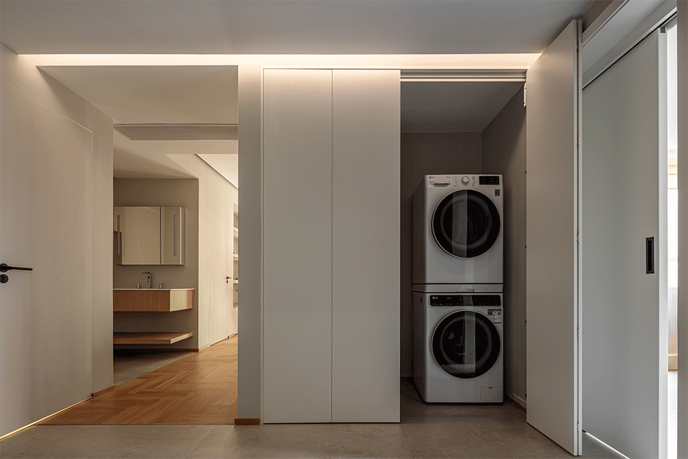 玄关柜以折叠柜门方式呈现,柜内集合了杂物及家政工具收纳等功能,并嵌入洗/烘衣机,叠加洗衣区,提高实用及便利性。