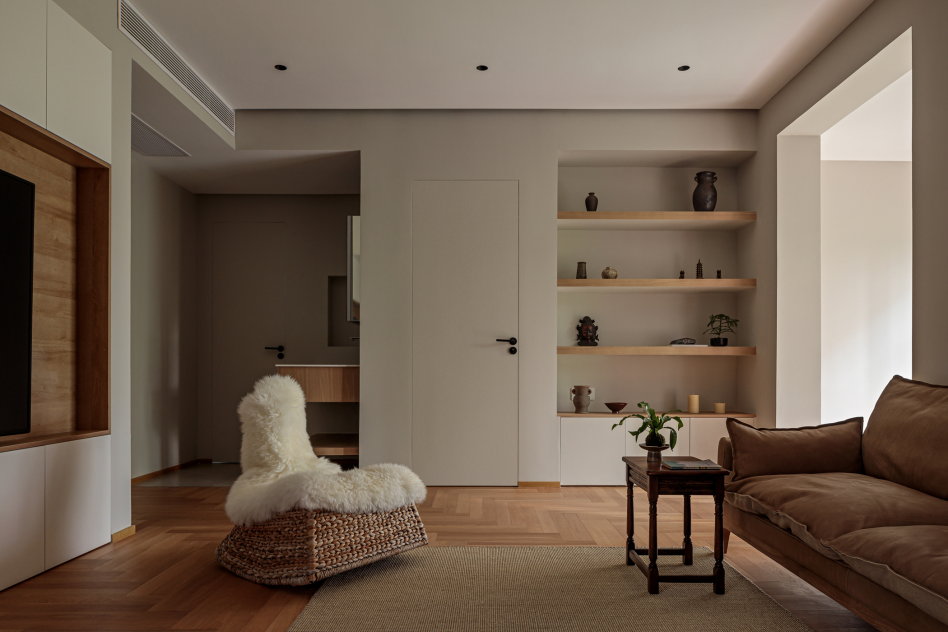 背景墙夹角处一方璧龛,在灯光的映衬下搭建出层叠的空间秩序感,人字拼橡木地板独特交错的纹路,带出温润且优雅的视觉效果。