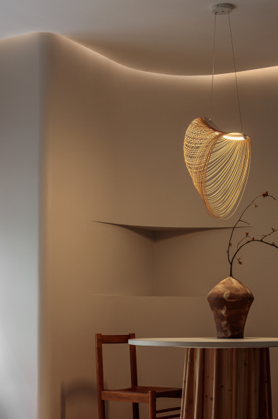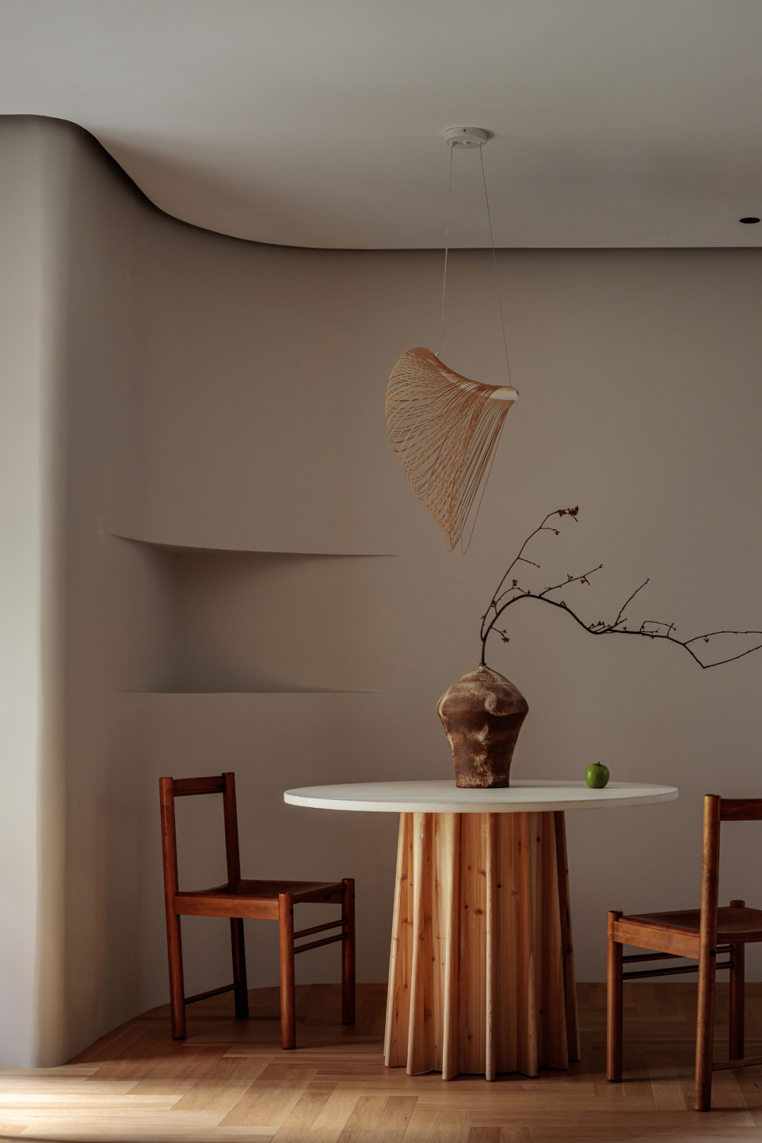 餐厅由原小次卧改造,设计师利用空间阴阳角结构,在餐区背景墙设计横向曲线,形成一个开放式的半围合感区域,与客厅弧形效果对应,给人来自两侧无限延伸的视觉意象。