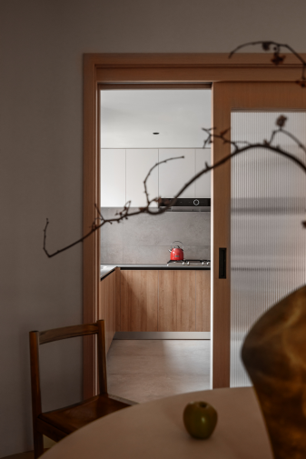 玄关左右两侧分别连接次卧与厨房,厨房设置双出口,另一侧连接客餐厅。顶面欧松板打底涂刷乳胶漆进行覆盖,既保留板材原有纹理、又缔造出自然的粗糙气息,与现代风格柜门形成对比,还原一场过去与现在的对话,令感官得到多维延展。