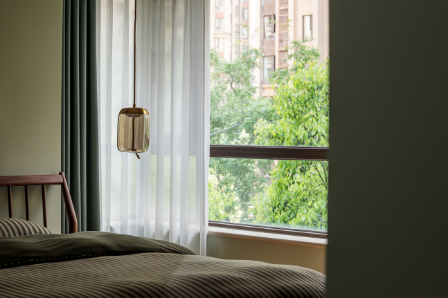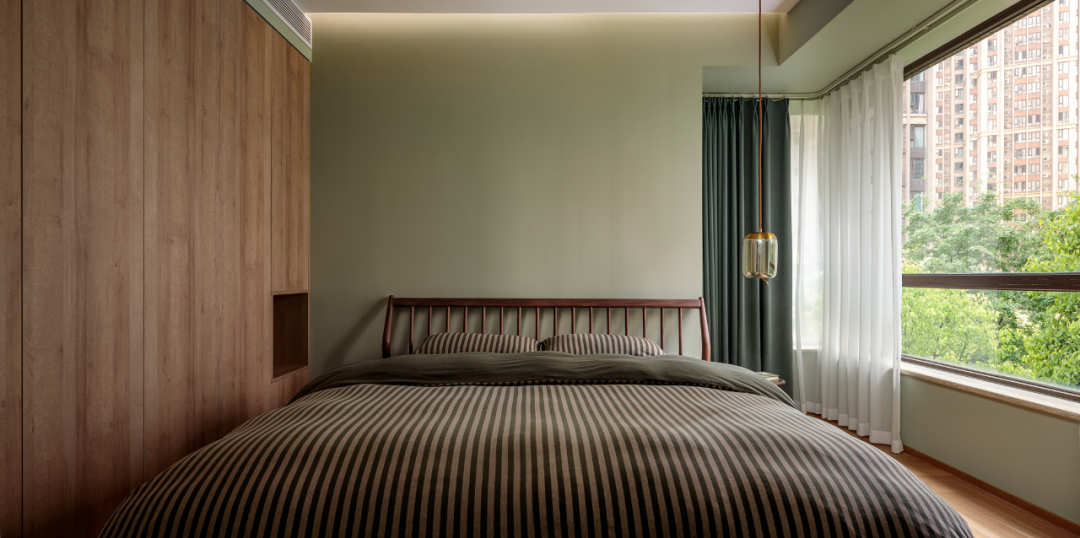 主卧整体采用了最能代表春色灵动的中国传统色彩——苍葭,与室外景观自然相融,造就空间中人、事、物与情境之间无形又有形的连接。