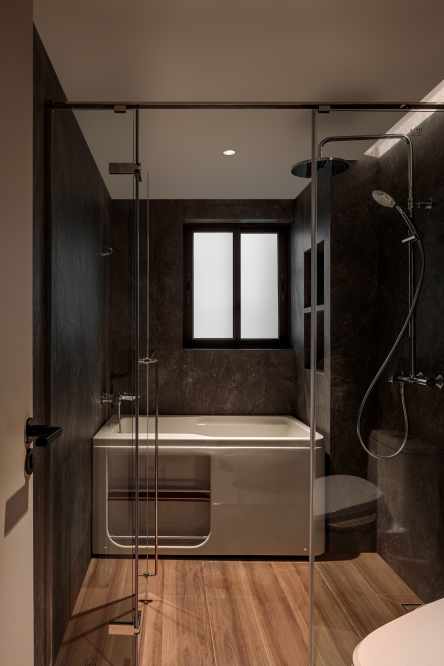 内部玻璃隔断隔开淋浴与马桶间,使得各功能区相互独立。独特的深色岩石纹理,带来治愈与空灵的体验,让使用者感到自在、放松。