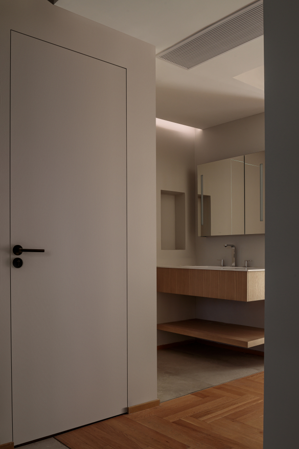 现洗漱台为原主卧入口,为提升卫浴间的使用体验,设计师更改主卧入口方向,预留出完整的功能空间,实现洗漱台外移、干湿三分离的卫浴布局。洗漱干区沿用了雾色与原木材质,与公区统一风格。
