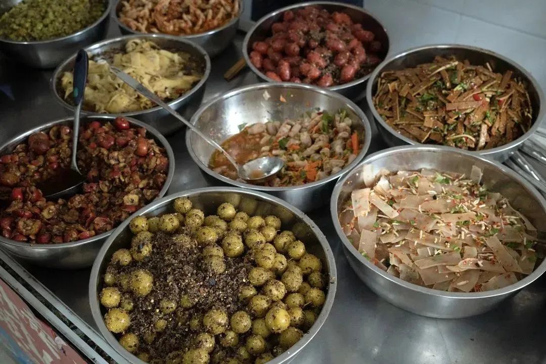 普洱的午后相当精彩,茶和咖啡承包了大半数人的时光,另外一半则钻进凉品店,豪横地点满一整桌。主食必须是凉米干,小吃则从泡鸡脚、凉拌橄榄、酸木瓜、炸洋芋、拌猪皮闭眼挑,再配杯凉虾或龙眼汁,酸的甜的辣的汇聚一堂,这便是当地人的完美下午茶了。
