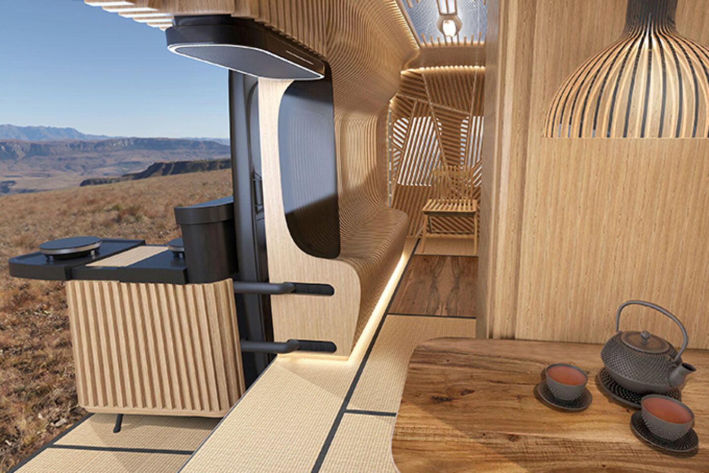 拥有非凡内饰的 Cross Cabin 更像是一件艺术装置而非露营车。这辆豪华房车铺设迷人的竹肋全衬里,散发出加持现代科技风情的精致美感。配合框架衬里,灯光布置和音响设备的巧妙置入也让 Cross Cabin 显露摩登流线型日式设计语言。此外,露营车还配备集成的座位区,可作为四人餐桌使用;同时,数字游民们还能从清晰的 32 英寸显示屏和内置键盘的智能桌面模式中得到乐趣。担心无线网络?Cross Cabin 当然会非常给力——将搭载 12 千瓦时高速移动路由器。