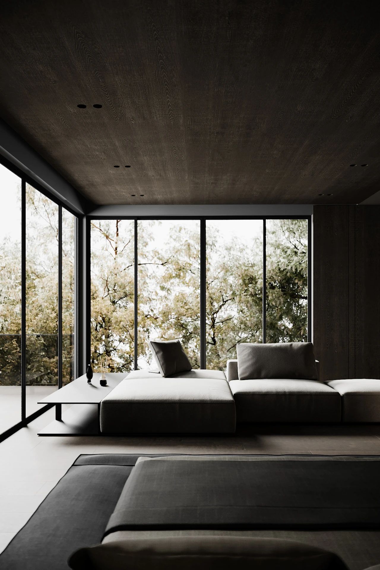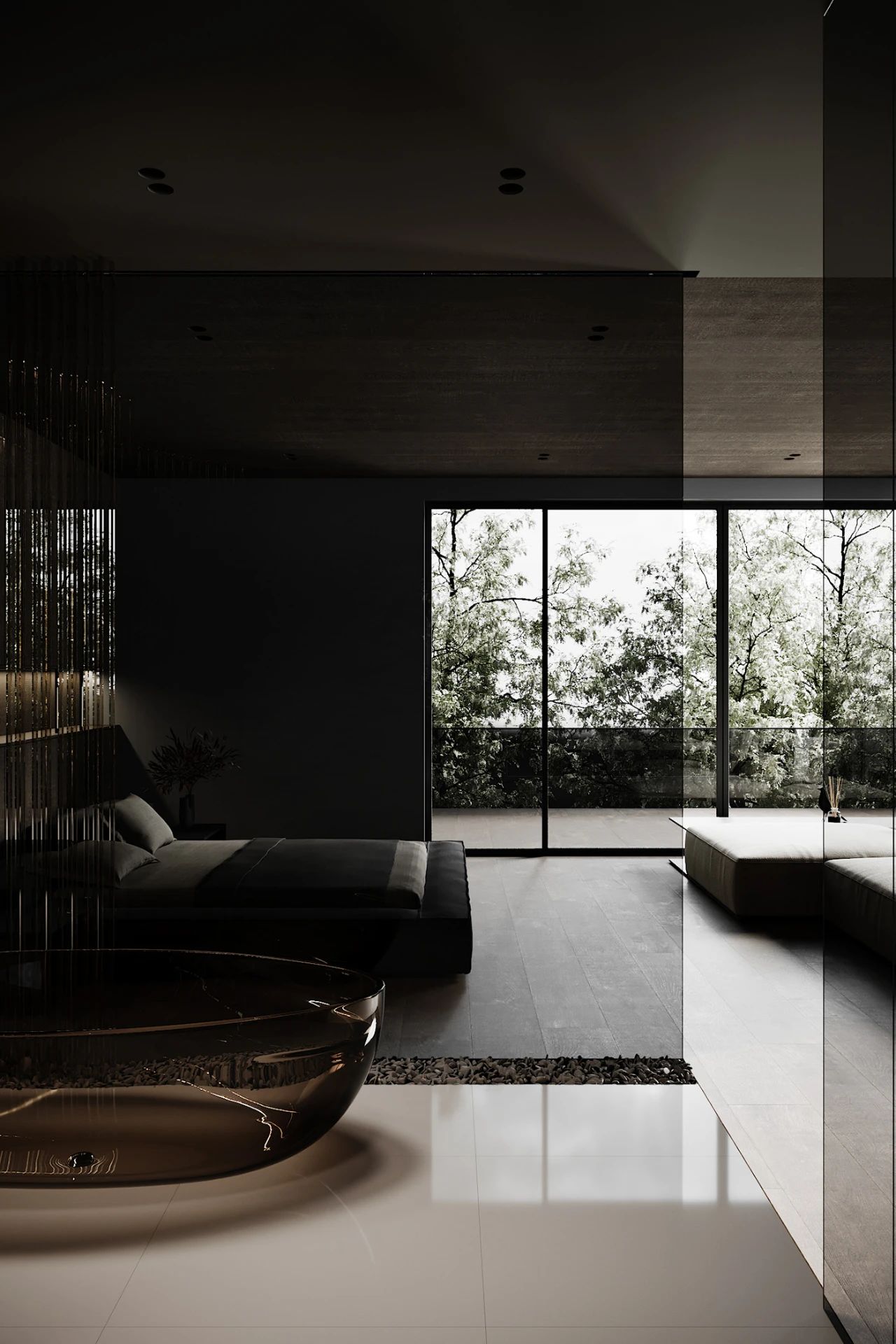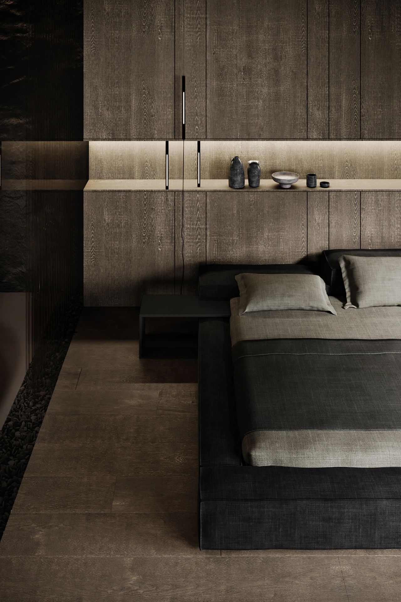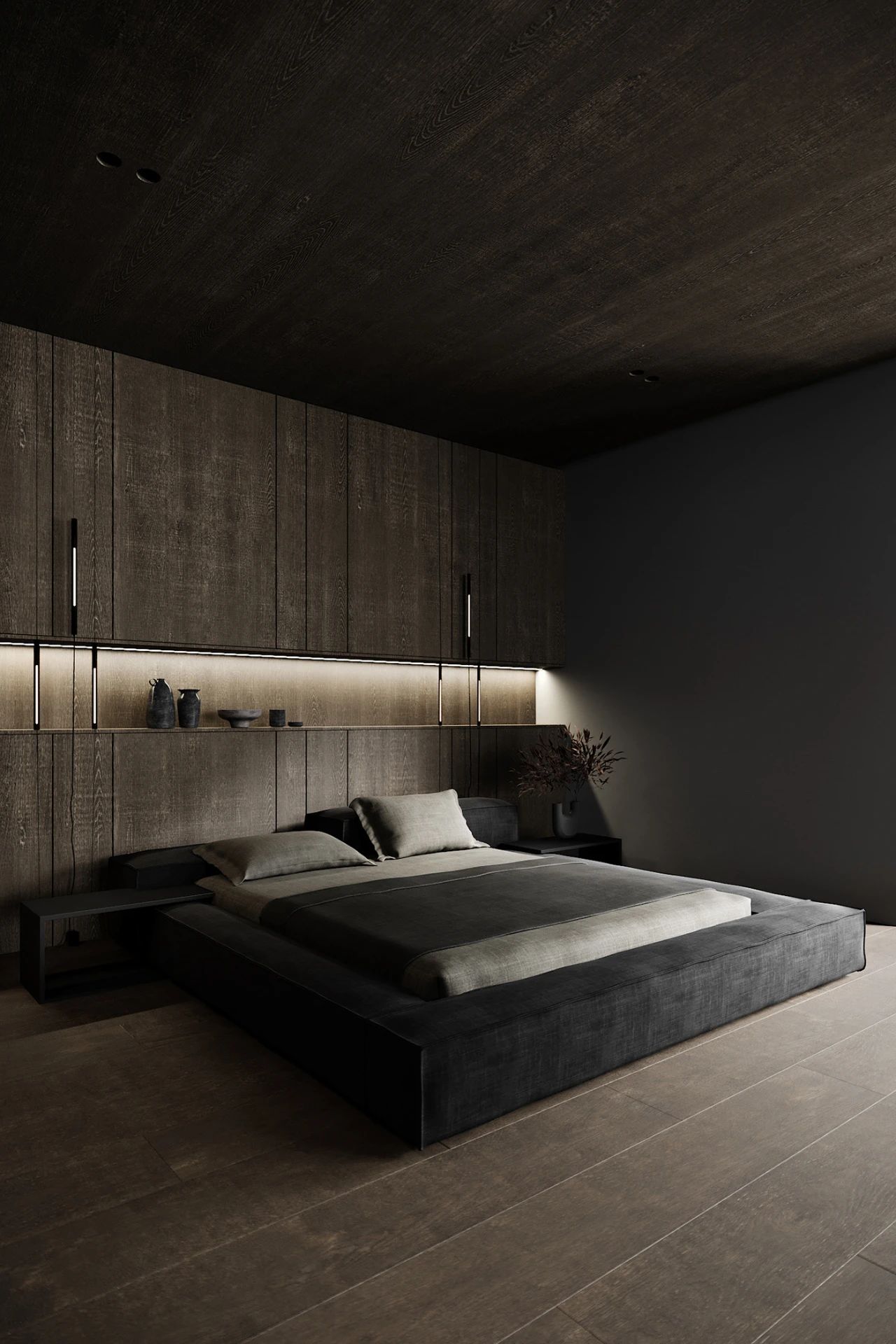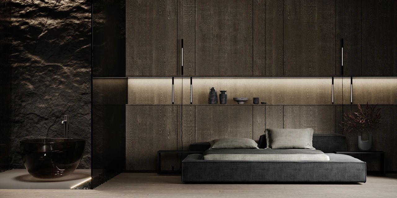 卧室的墙面与客厅采用一样的木制材料壁龛贯穿整个墙壁并且安装了氛围灯让卧室看上去很温馨,大面积的落地窗给卧室提供了充足的采光卧室当中还摆放了一套沙发把起居室与卧室形成一体。