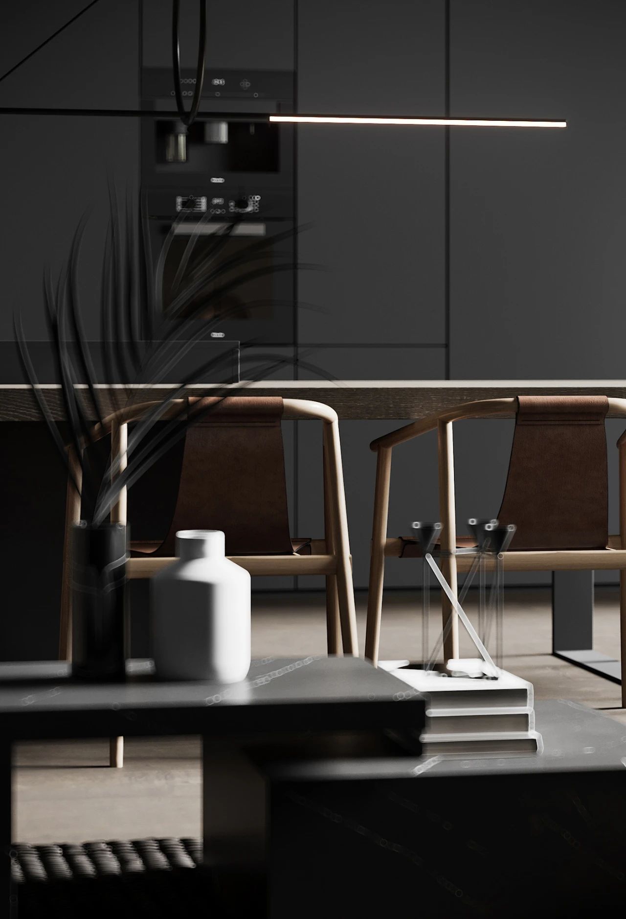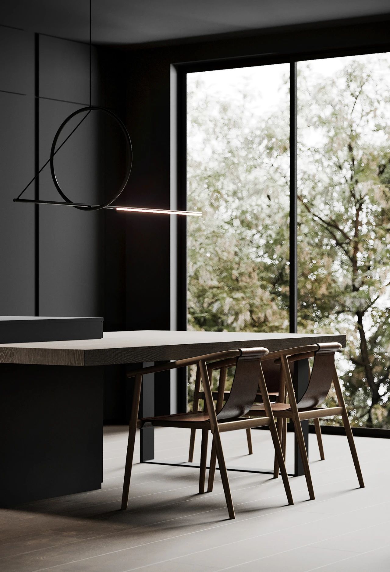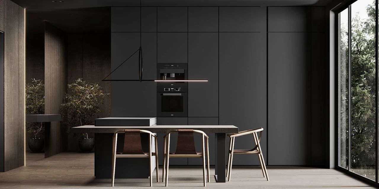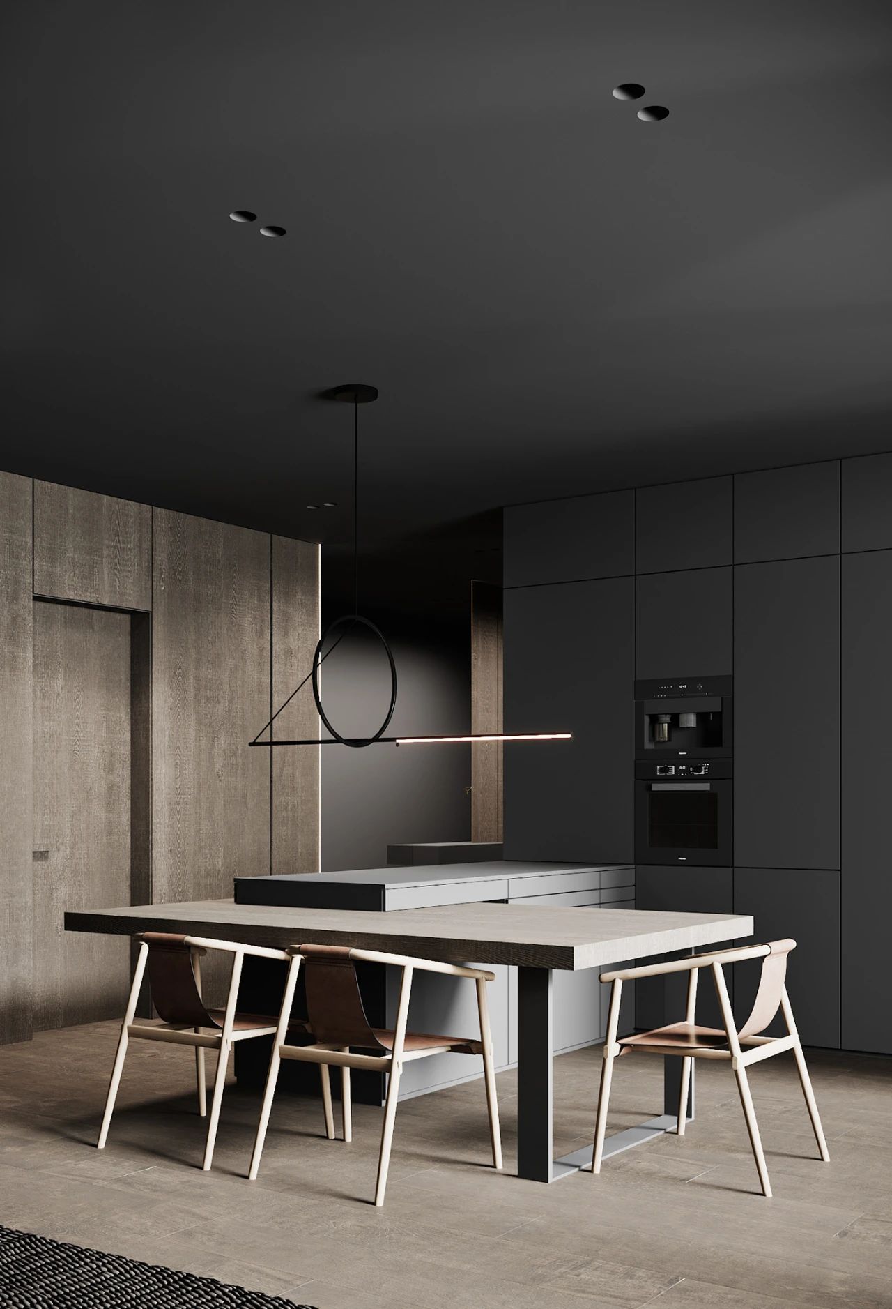 木制墙壁与大理石茶几在材质上形成明显的对比,餐厅和厨房毗邻客厅,餐厅以灰为主色调操作台与岛台连成一体既节省空间又增加整体感。餐椅是由木制框架与皮质坐垫拼接而成,非常的精致配以几何图形的吊灯充满现代感。