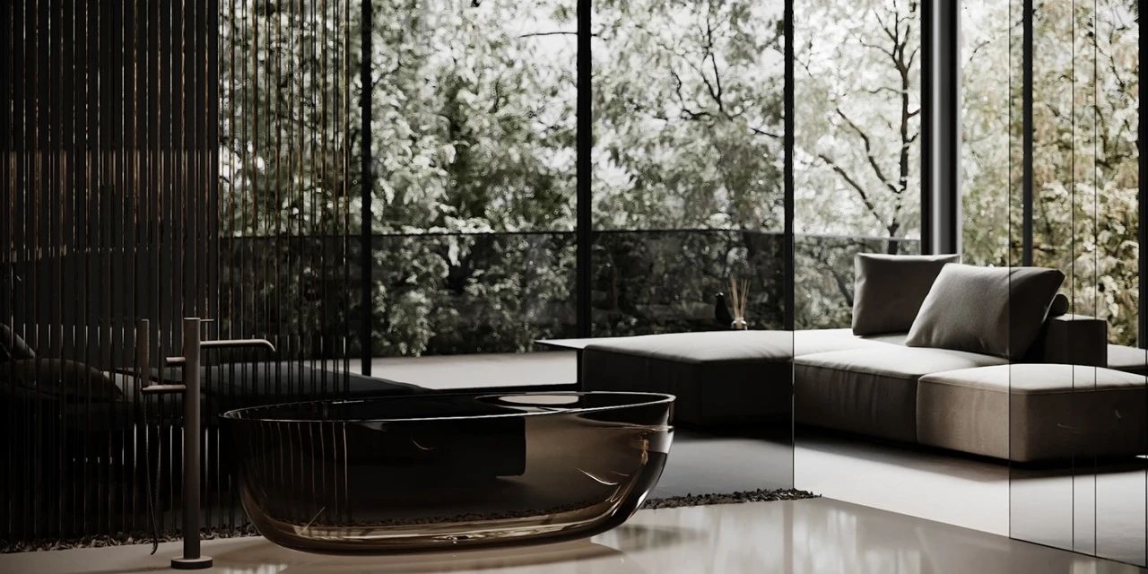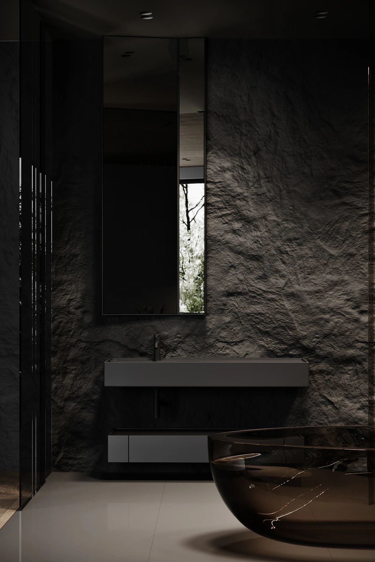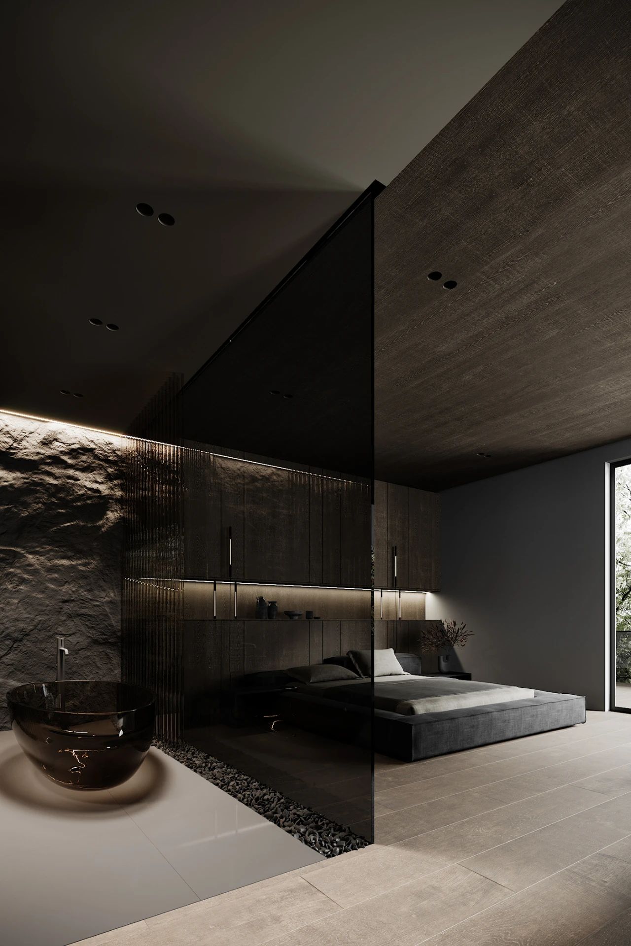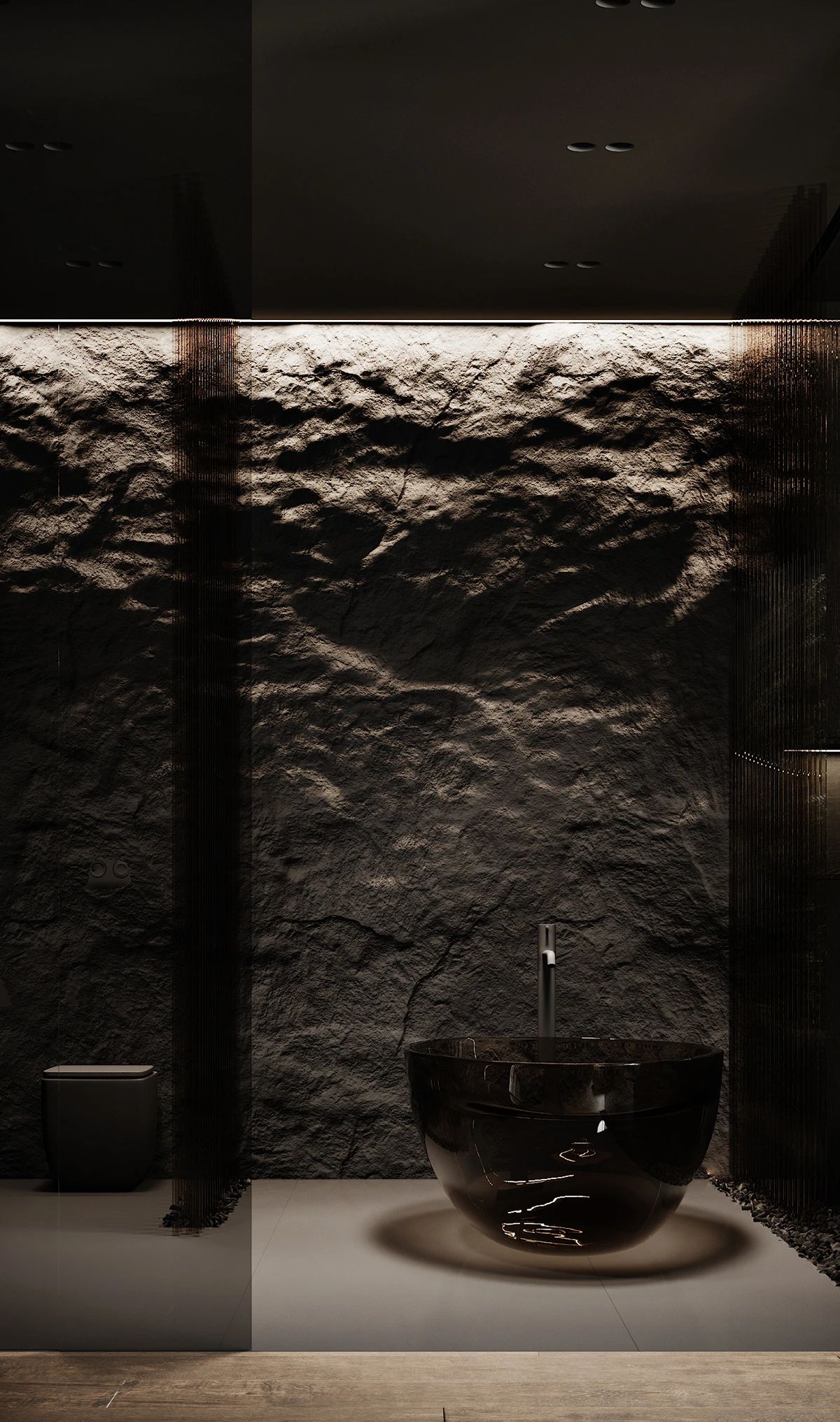主浴室以茶色玻璃包裹地面则采用大理石材质既美观又实用,浴室的墙壁以岩石装饰粗糙的岩石与光滑的茶色浴缸形成强烈的对比。浴缸的一边放满了鹅软石鹅软石给浴室增加了美感又能吸收潮气简直一举两得。