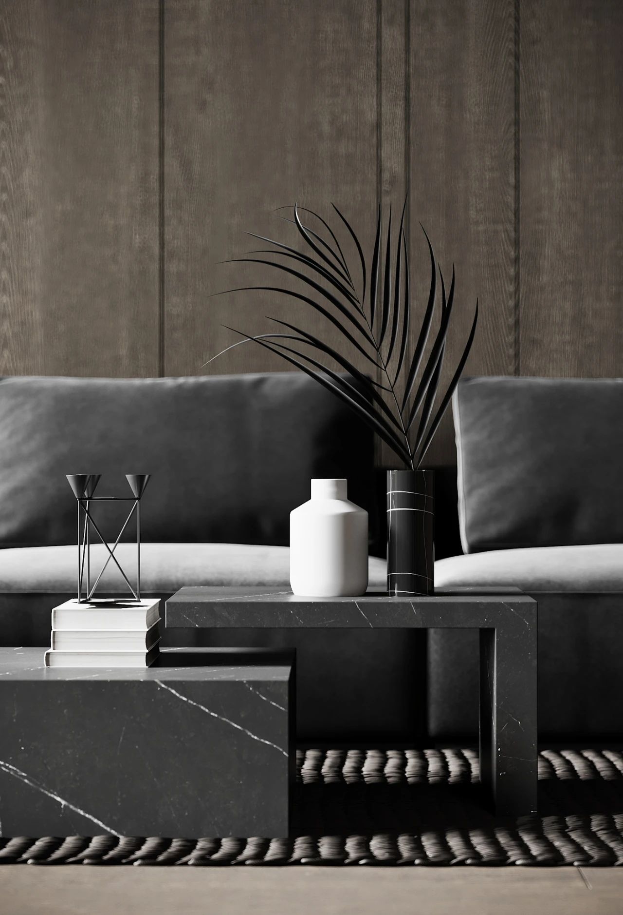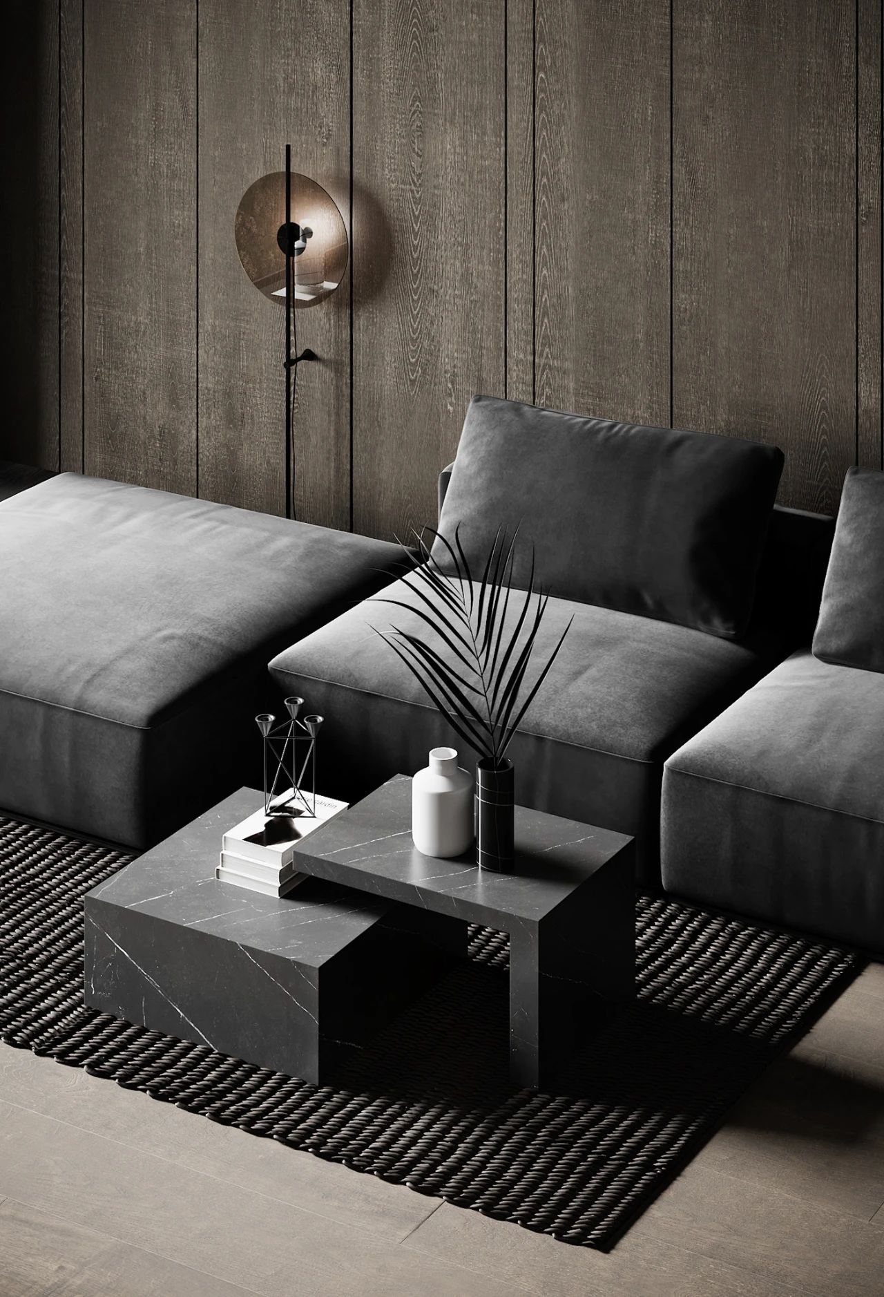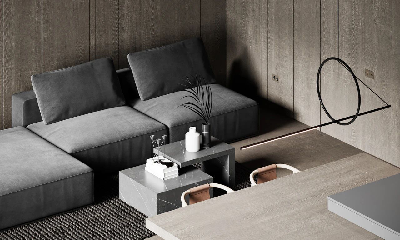 这个公寓位于法国由 Anastasiia Reznichenko 设计,整个公寓以灰色调为主及大量的木饰面装饰看上去十分高雅,沙发与茶几都是灰色的茶几是采用大理石材质制成的配以藤编地毯设计感十足。