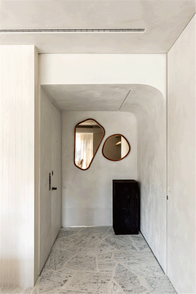 玄关的设计比较现代化,走廊尽头的墙面运用两块茶镜装饰凸显出轻奢元素的同时又增加了色彩与黑色的玄关柜也融合得恰到好处,玄关顶部转角打造成弧形不显厚重又不缺失质感。