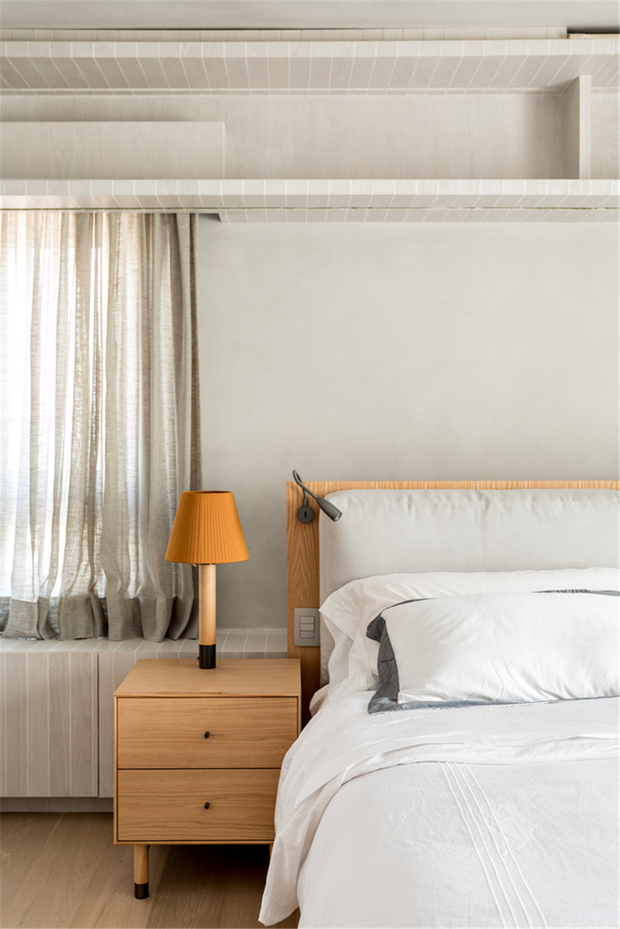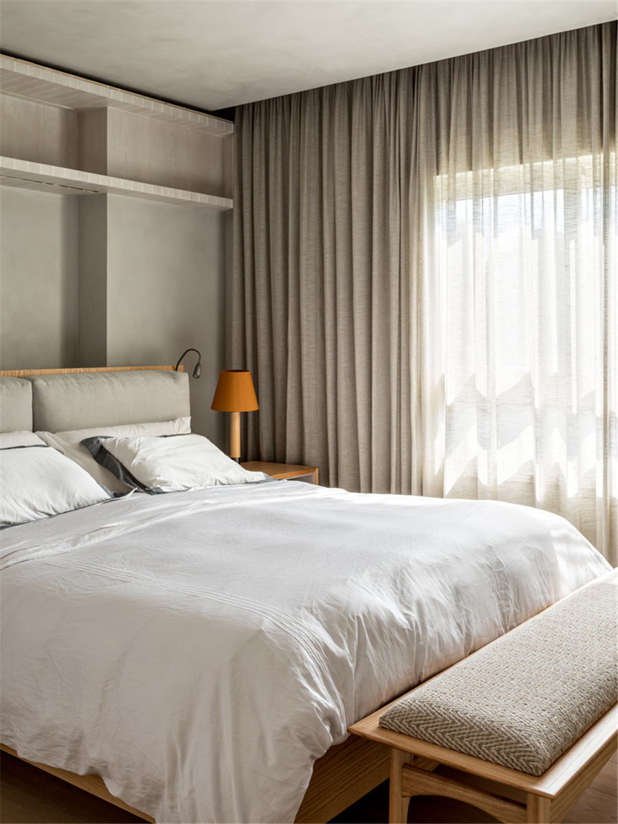 卧室在低调的灰色系中加入了橘色和原木色,增添了不少艳丽和鲜活气息,床头顶部留有开放式的储物空间可以摆放任何自己喜欢的物品。