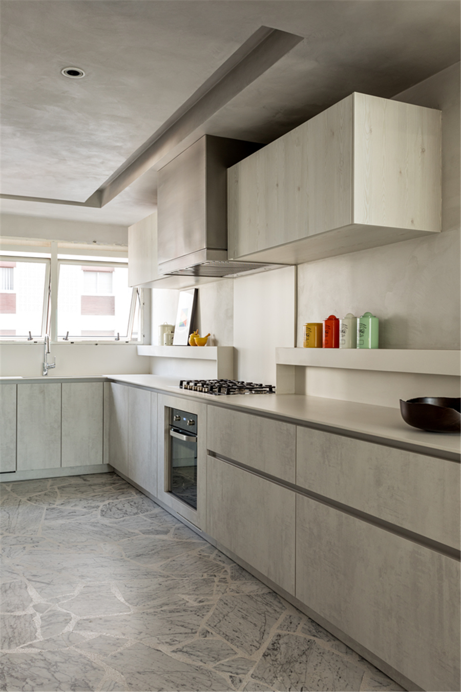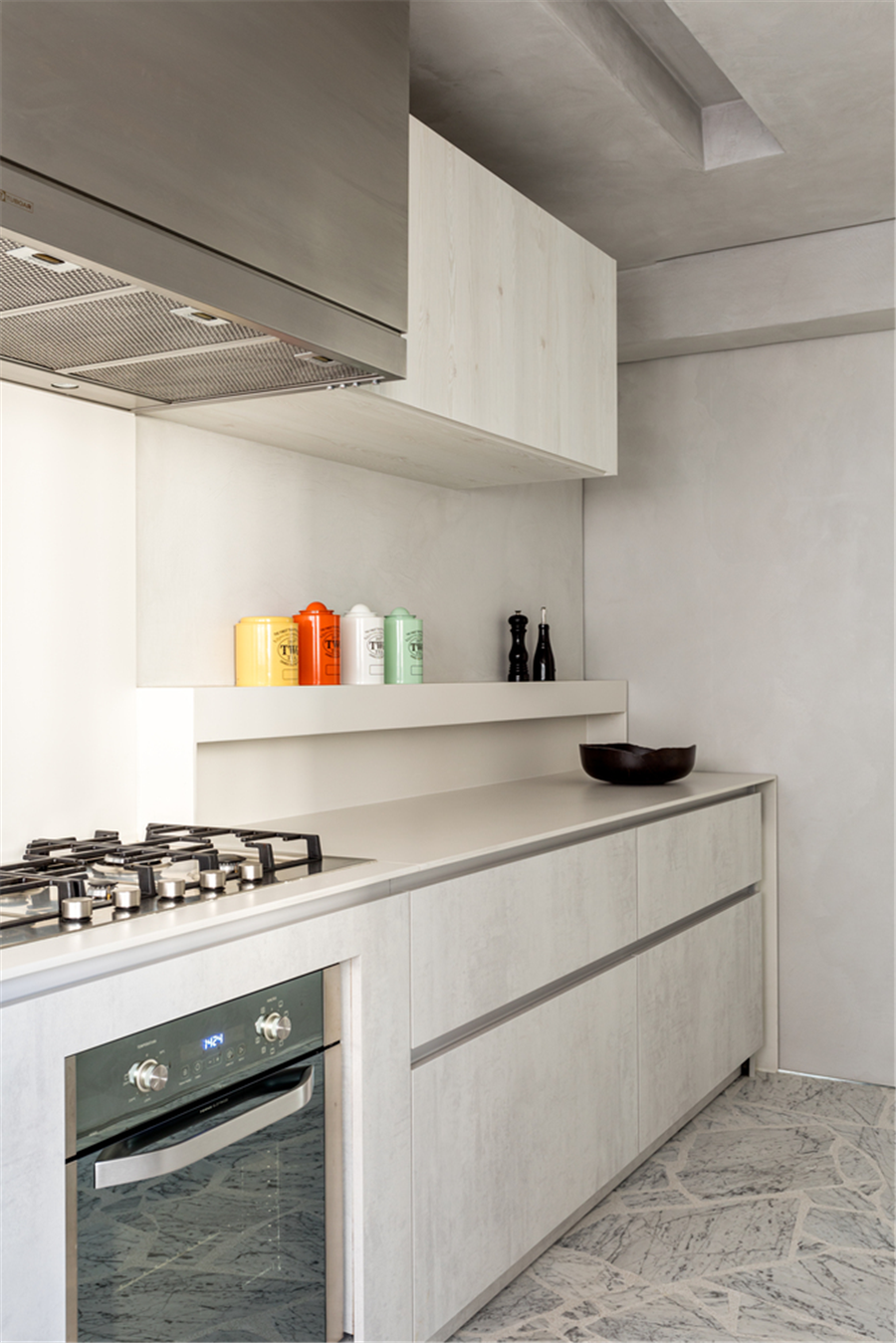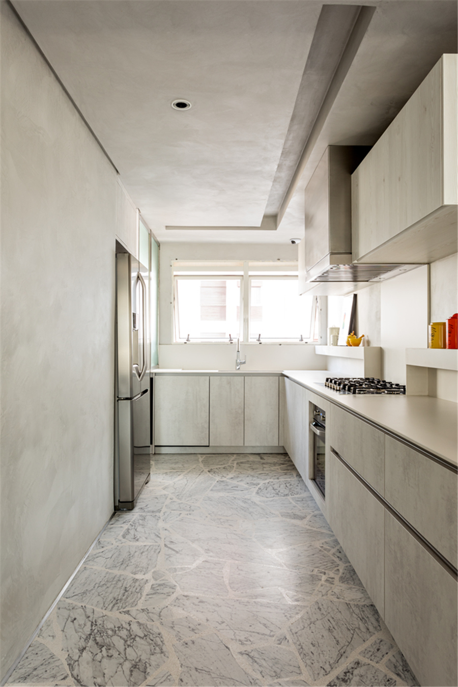 厨房内以灰色调为主从美学与功能的角度来打造实用空间,强调着生活的精致又不远离烟火气。
