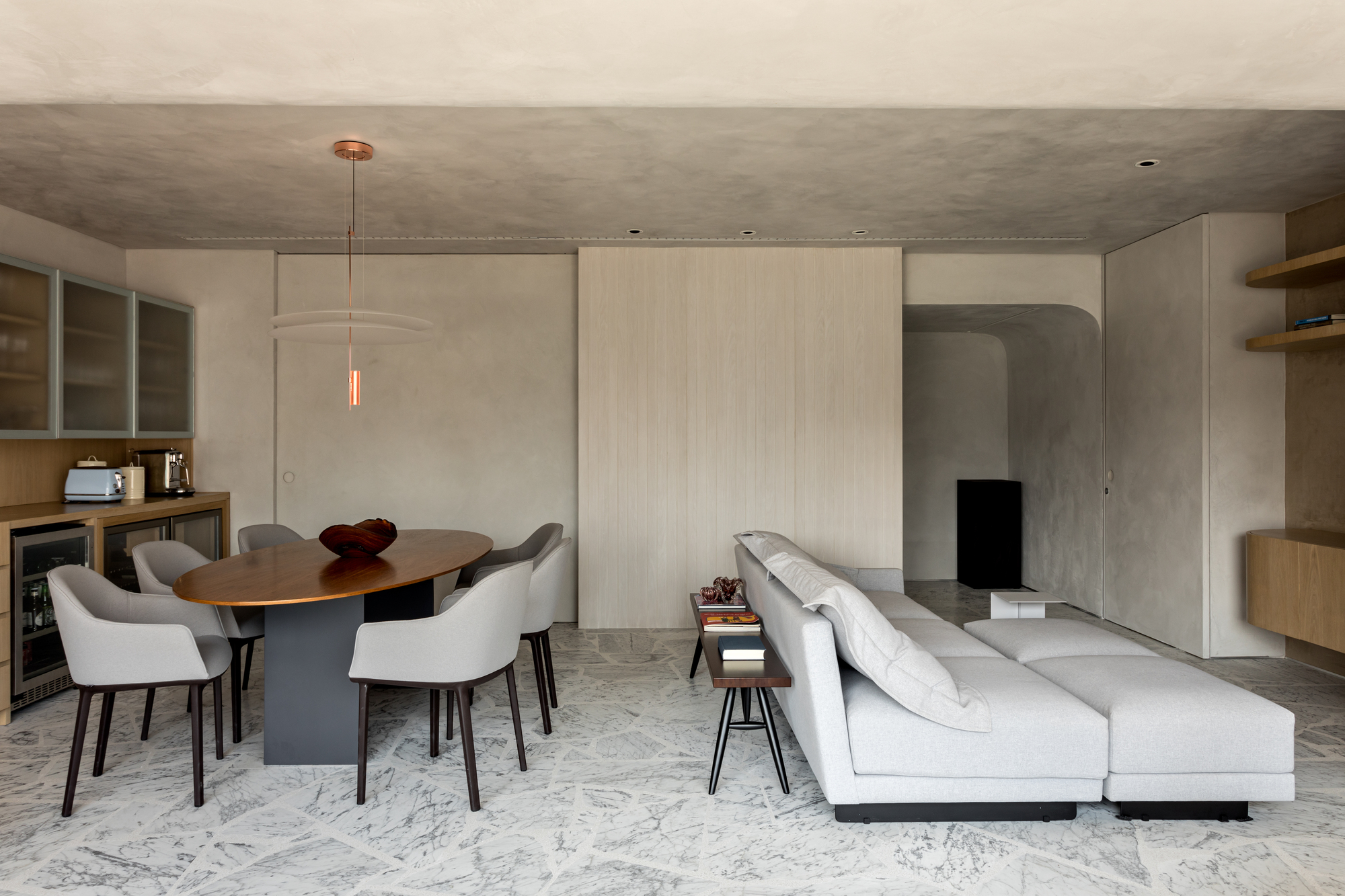 开放式的起居空间,碎大理石拼接成的地板与硅藻泥墙面结合质朴而不失格调。客厅的区域较小,浅灰色的沙发搭配白色的小边几,沙发后摆放着长板凳做书架带来更多储物的便利。