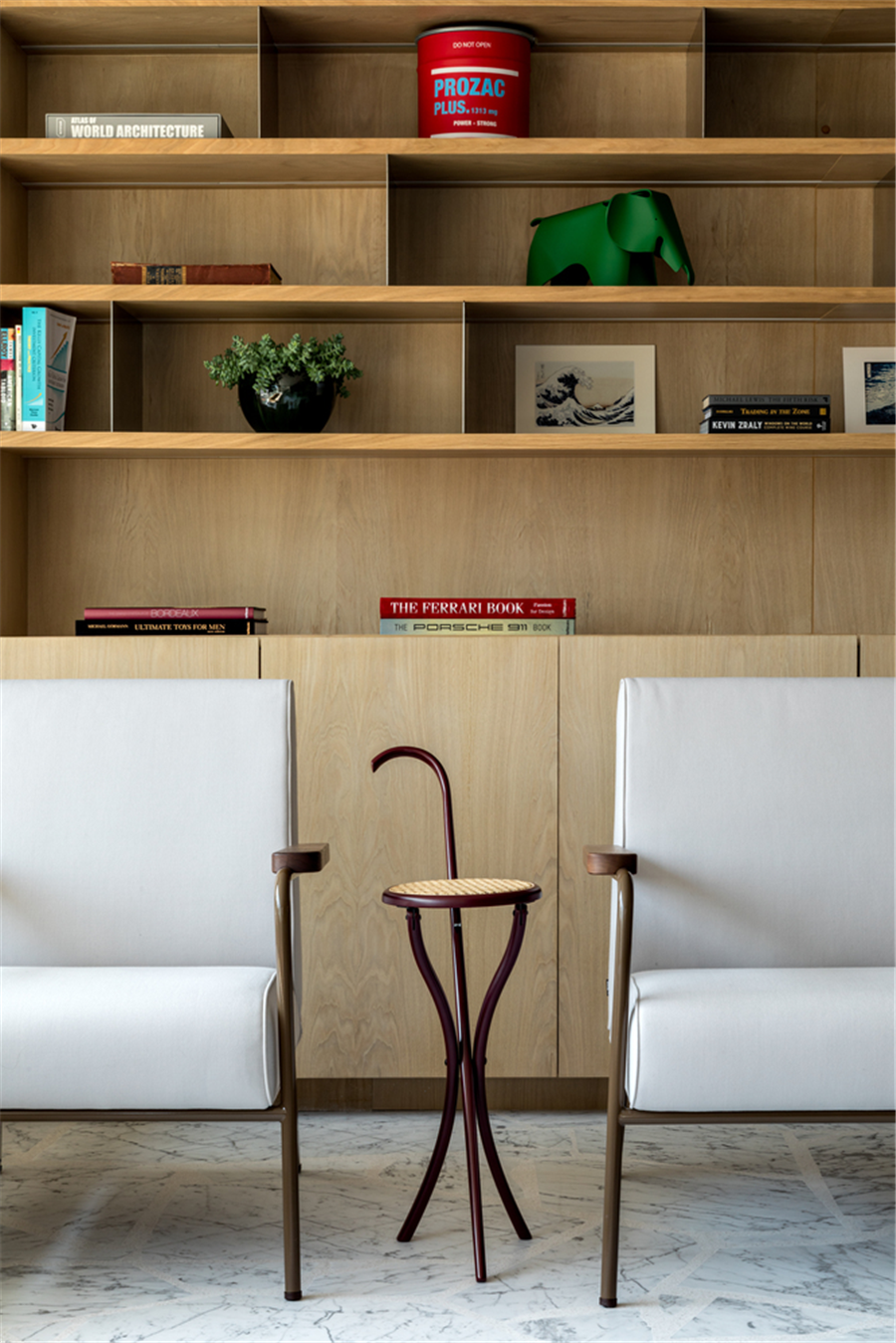 背后的储物空间从客厅延续至此作为展示柜使用,摆放上各种摆件装点在低调中彰显品位生活。