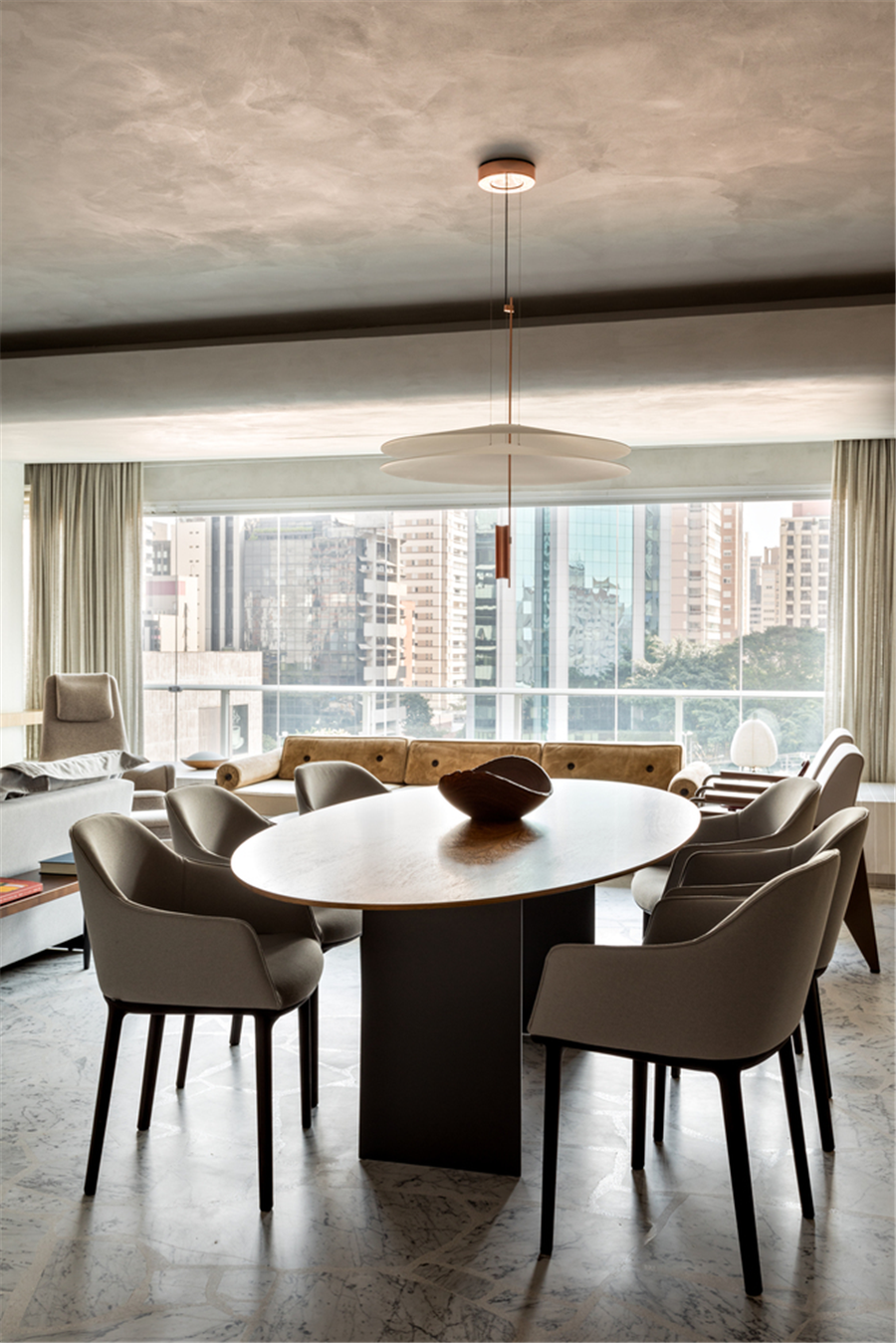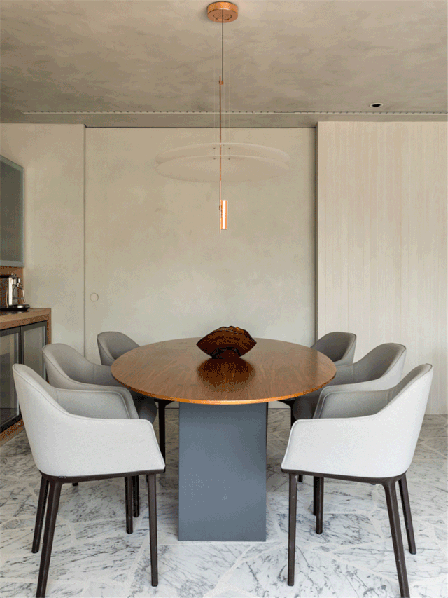 客厅背后是餐厅 6 把灰色的餐椅,围绕椭圆形餐桌摆放,顶部的吊灯款式时尚,上轻下重的搭配整体看上去更具时尚韵味。原木打造的餐边柜有大量储物空间,满足了餐具酒水等物品的收纳需求。