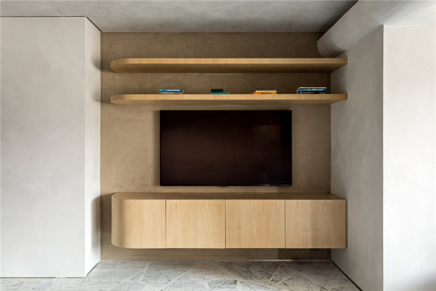 原木色的电视背景墙以最简单的方式创造出温暖舒适的感觉,搭配挂壁式电视柜和搁板,通过材质与造型的变换让空间更富高级感,利用自然光线为室内带来通透明亮的视觉感受,。