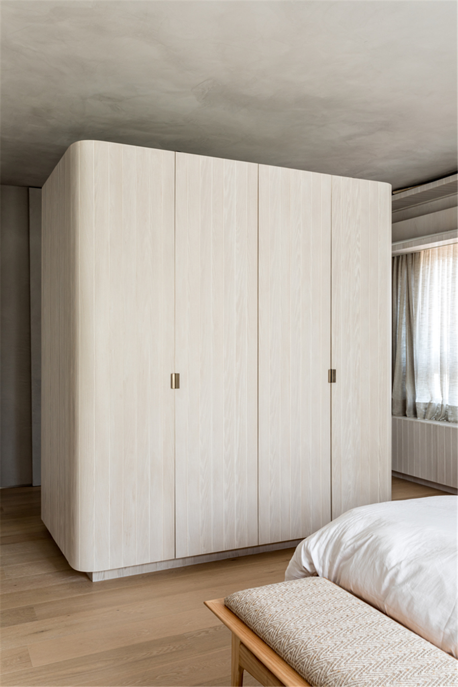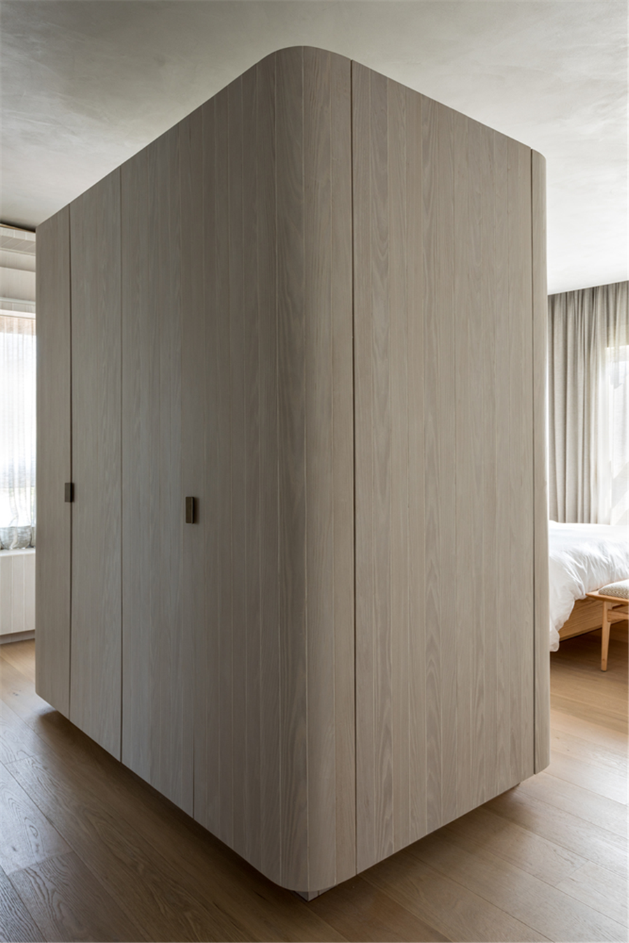 卧室内还设有一个独立的衣柜浅色木柜体,弧形的边角给主卧空间注入不一样的气质和高级感。