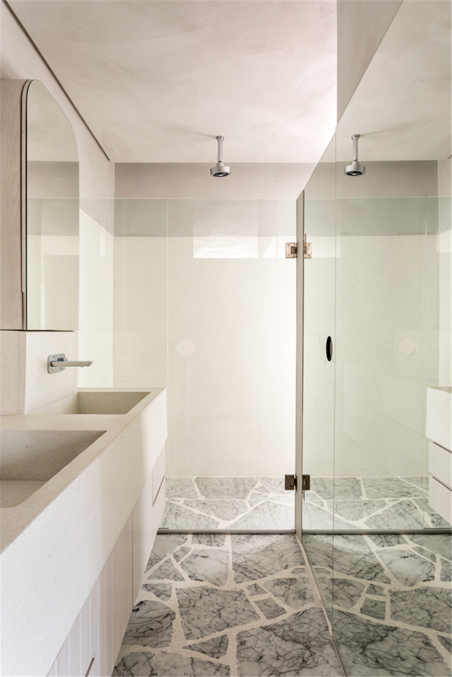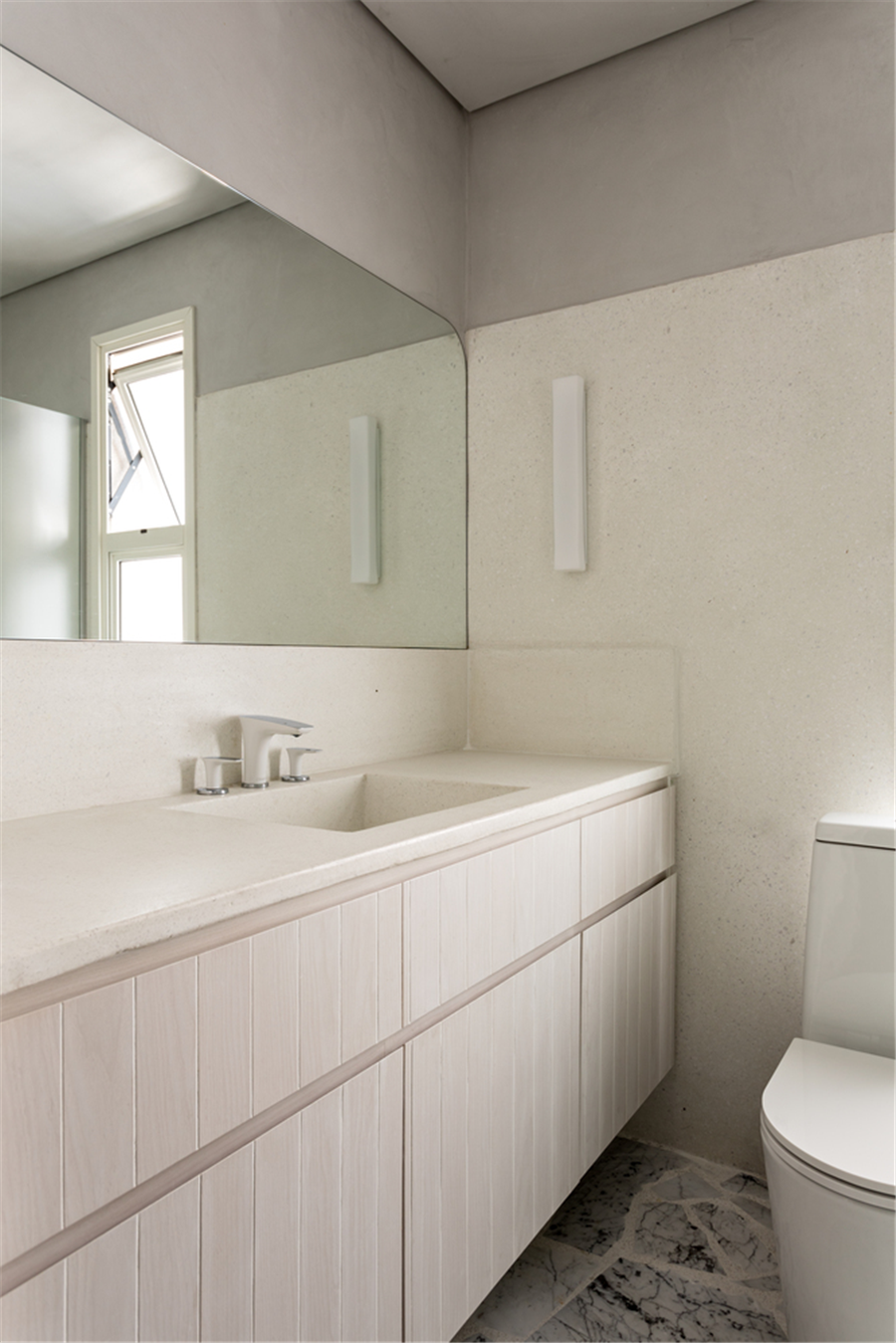 次卫的面积较小布局紧凑,自然纹路的大理石地面连接着水磨石墙裙注重功能性同时又有美感性。