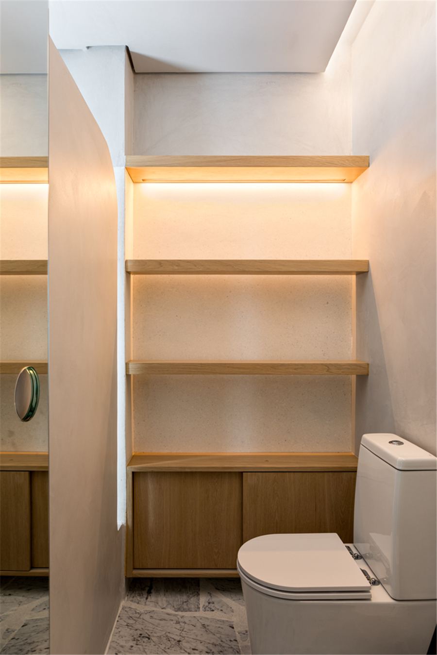 坐便区设置的较为私密,旁边还有搁板和柜子储物利用好了每一寸角落空间。